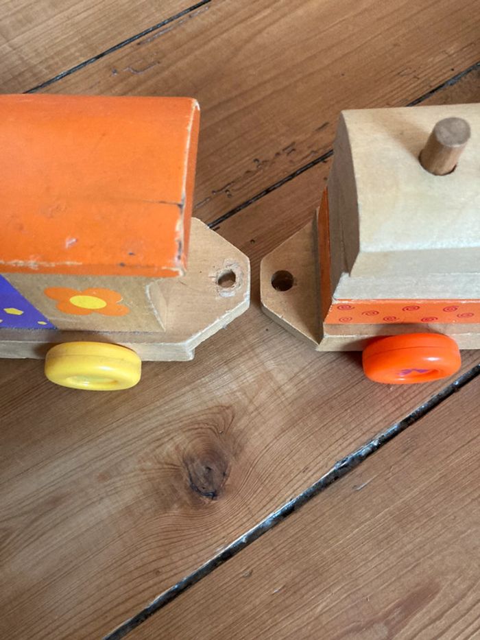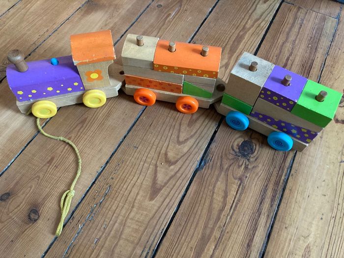 Train en bois à tirer en bon état Manque une attache (voir photo) Jeu d’empilement