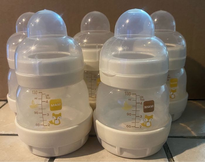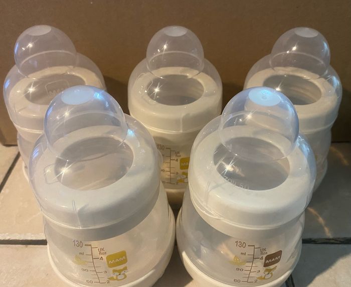 Lot de 5 Biberon mam, jusqu’à 130ml, je l’es vends sans les tétines, couleur blanc/crème
