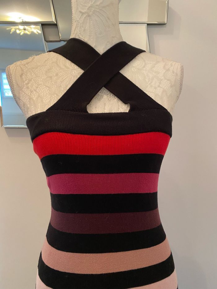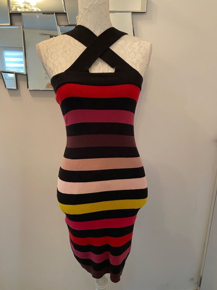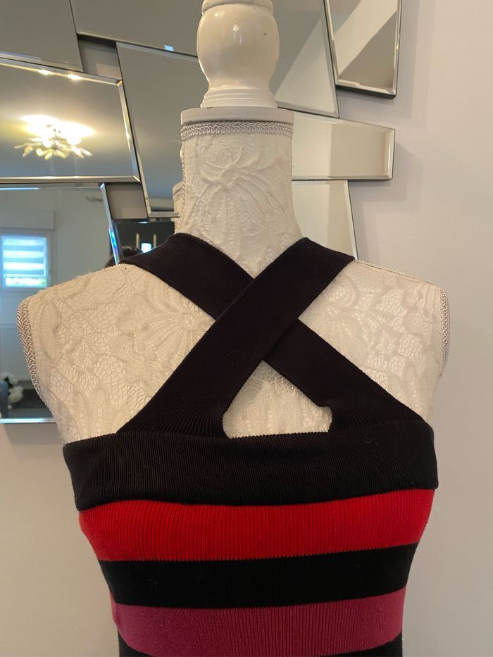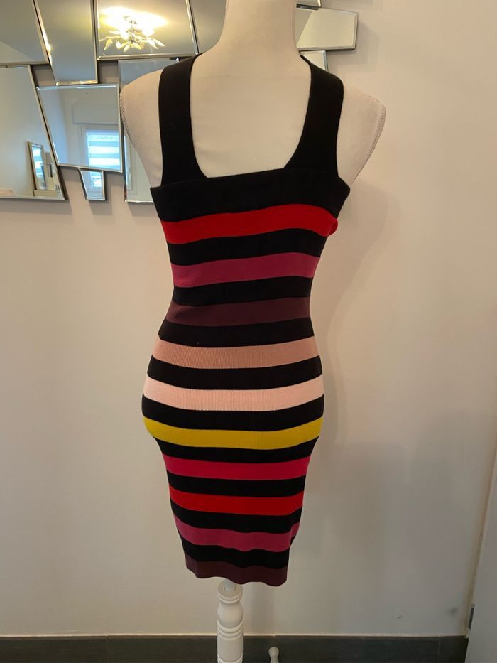 Robe issue de la collection Sonia Rykiel pour H&M 🖤 Robe ajustée en maille extensible, à rayures multicolores 🌈, avec un décolleté croisé élégant qui met joliment la silhouette en valeur 💃 👗 Marque : H&M collection Sonia Rykiel 📏 Taille : XS ✨ Coupe : près du corps 🎨 Motif : rayures multicolores 👌 État : peu portée, très bon état Parfaite pour une tenue chic et originale, de jour comme de soirée 🌙✨