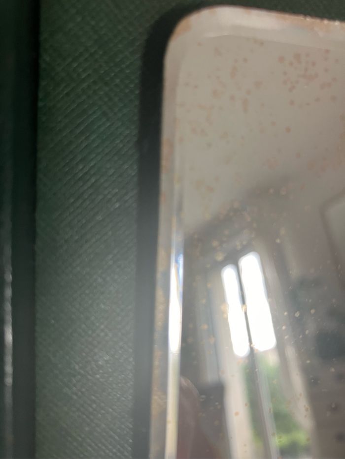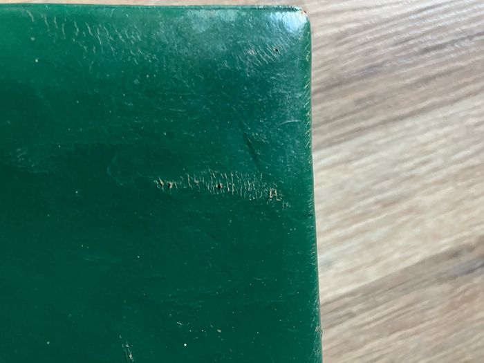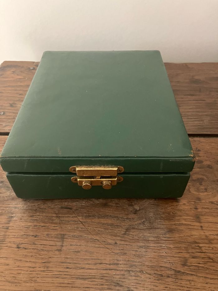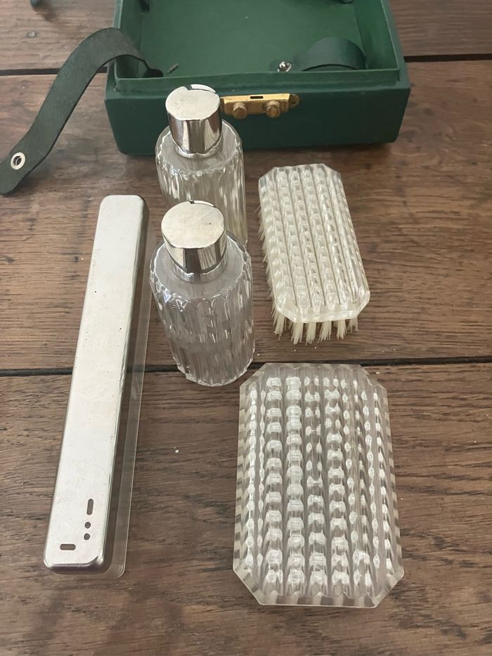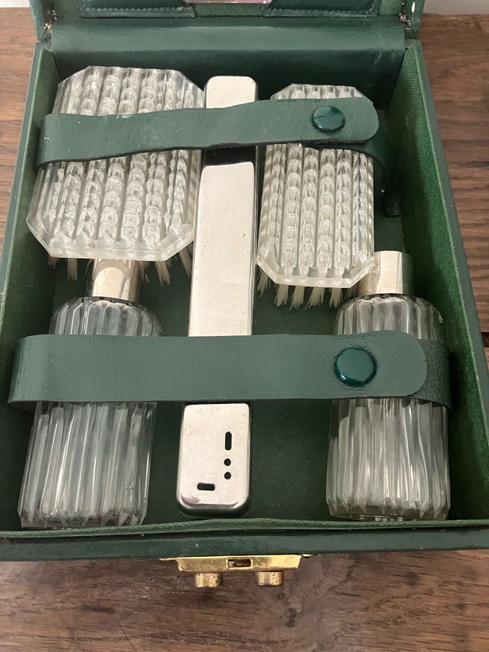 Ce nécessaire de toilette est vintage. Coffret « capitonné » vert. Dimensions : . largeur : 18,5 cm . Hauteur : 5,5 cm . Profondeur : 19,5 cm Il est en état satisfaisant mais porte les traces du temps : « râpé » par endroits( voir photo), miroir piqueté (voir photo) Contient : - 1 étui de brosse à dents - 2 brosses / je pense qu’elles sont en Bakélite mais je ne peux l’affirmer - 2 flacons en verre - 1 lime Système de fermeture fonctionnel