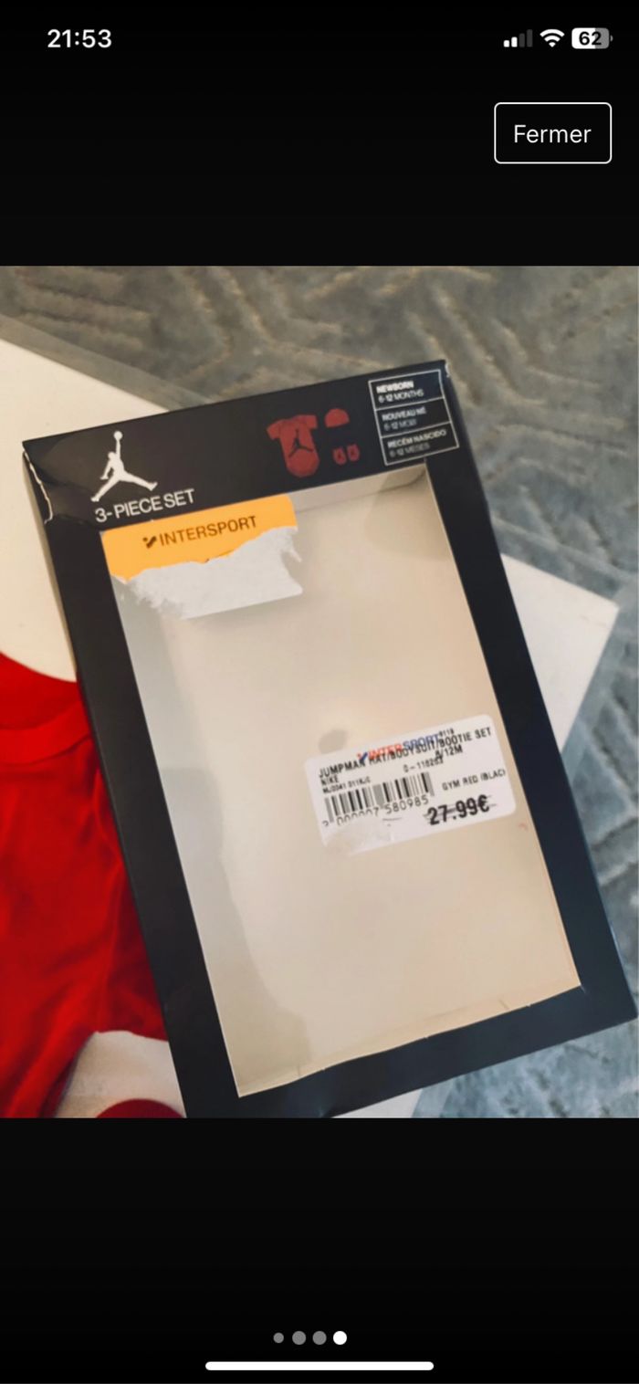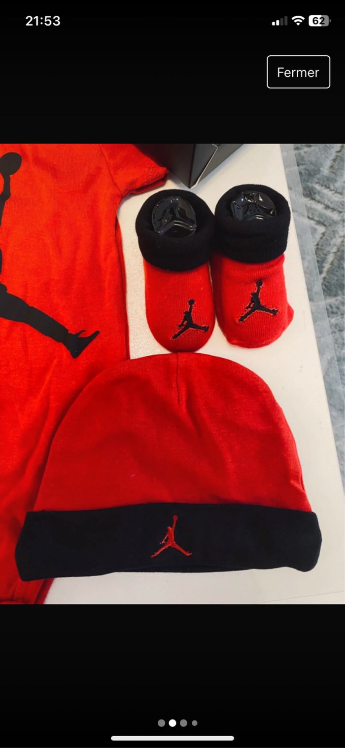 🎁 Coffret cadeau bébé Jordan – 3 pièces neufs 🎁 Ensemble bébé composé de : 🧦 1 paire de chaussettes 🧢 1 bonnet 👕 1 body 📏 Taille : 6-12 mois 🏷️ Marque : Jordan 🆕 État : Neuf, – idéal pour un cadeau 🎂 ou une naissance 🎀