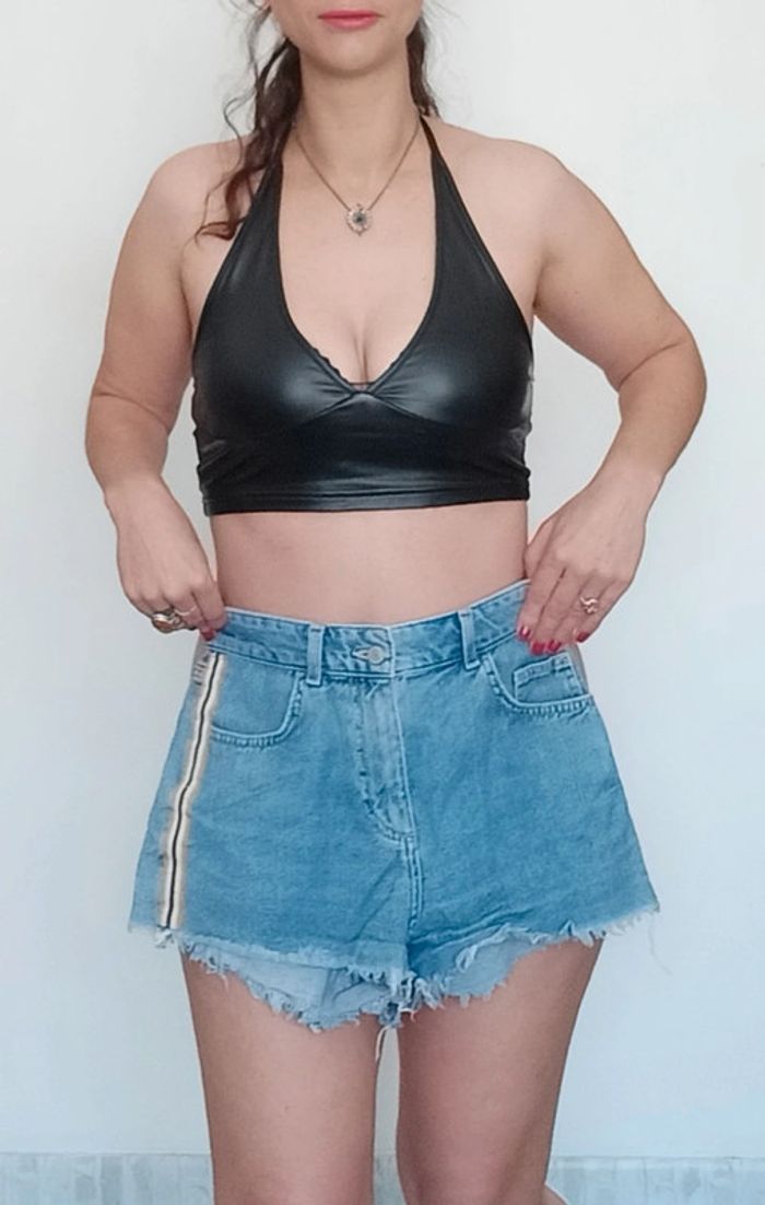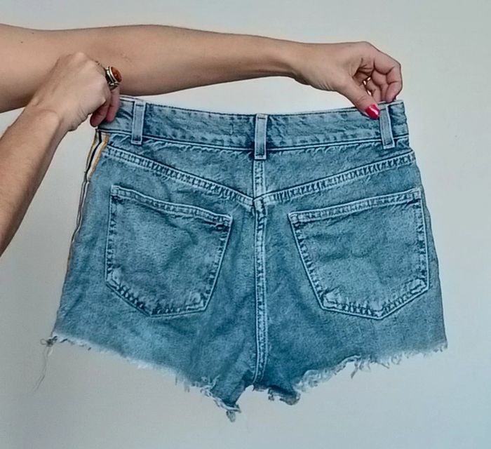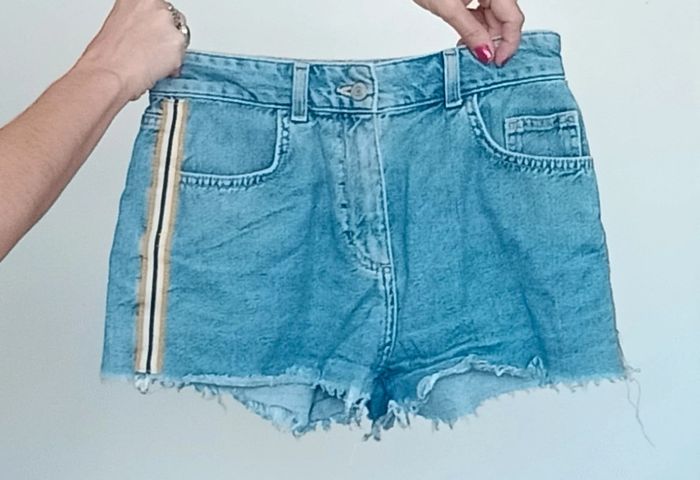 📣 Pour un lot, me contacter 😊🌸 -10% pour deux articles achetés -20% pour trois et + 🥰 #poupoupidou38 🫶🫶🫶🫶🫶🫶🫶🫶 Short en jean, court, effilé en bas, bande colorée coté, taille 38, basic facile a porter et a assortir #short38 #shortjean38 #shortcourt38 #shortbasic38