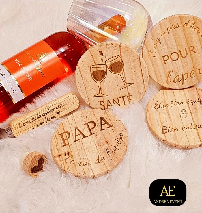 La fête des pères approche à grands pas ! Quoi de mieux qu'un kit spécial apéro, pour lui offrir ? 🥂 Composé de 4 sous-verres, 1 décapsuleur & 1 bouchon, c'est LE kit parfait pour les papas extras 👌 Le tout en bois gravé 🤩