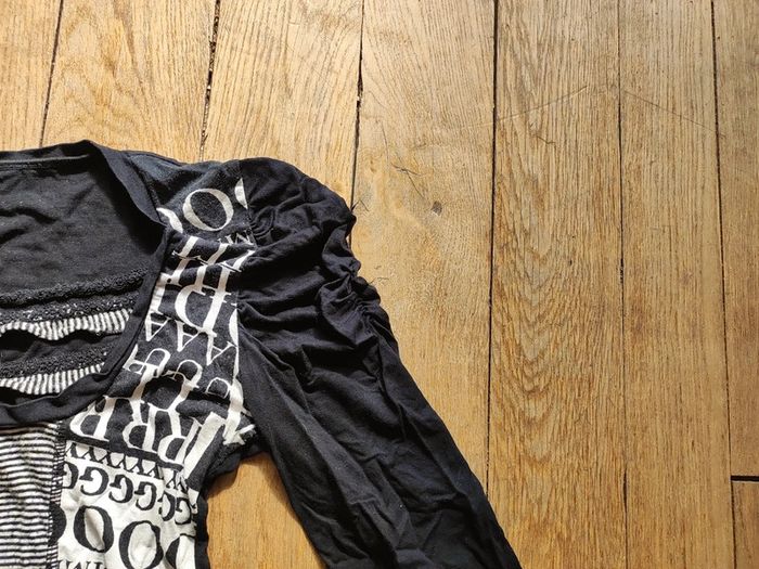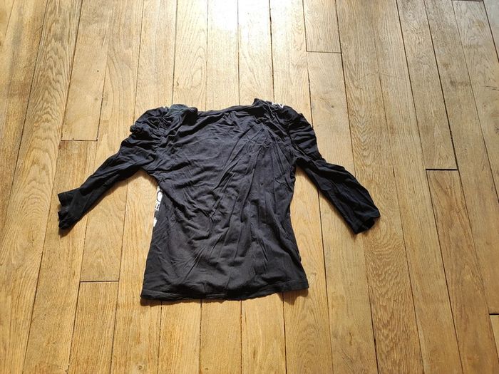 Manches 3/4. Épaules légèrement plissées. Joli petit décolleté. Couleur noire légèrement passée à certains endroits.