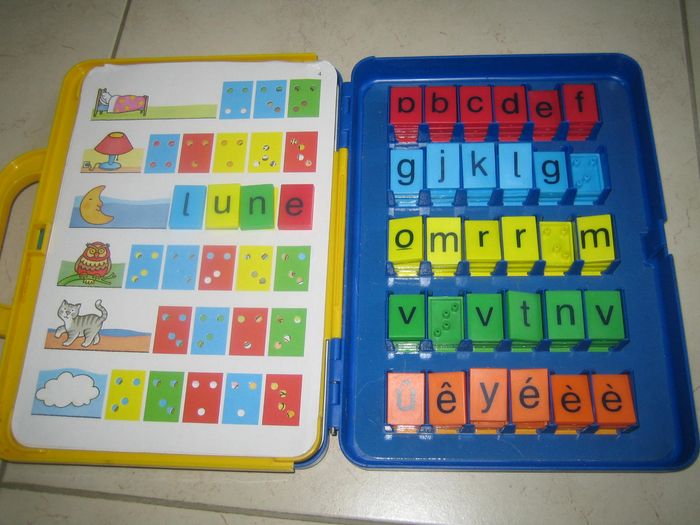 En très bon état, jeu complet . Pratique en forme de mallette l'enfant peut l'emmener partout Avec J'apprends à lire, l'enfant démarre son apprentissage de la lecture en composant des mots à l'aide des jetons lettres. Sur chacune des planches, l'enfant lit l'étiquette lui indiquant le nom des 5 illustrations. À lui d'écrire ces mots. C'est ludique, la difficulté est progressive, le jeu auto correctif et la mallette permet d'emporter facilement J'apprends à lire.