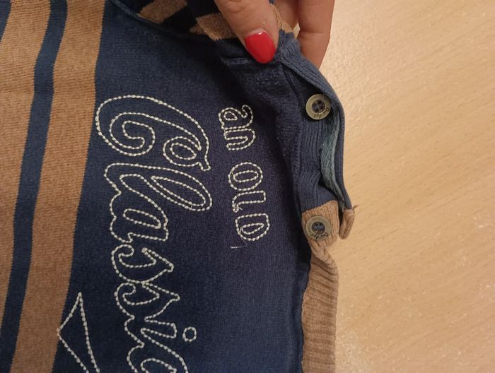 Pull marron et bleu marine, orchestra, 6 ans, boutonnière sur le côté gauche du col