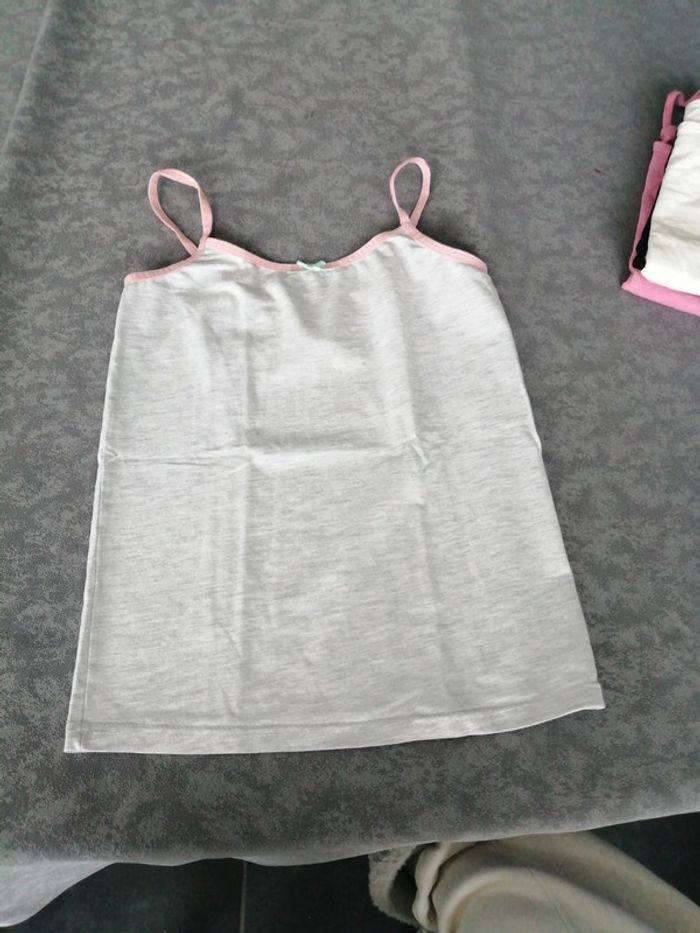 A vendre débardeur gris avec petit noeud bleu devant et couture rose sur le haut, taille 10 ans, marque action