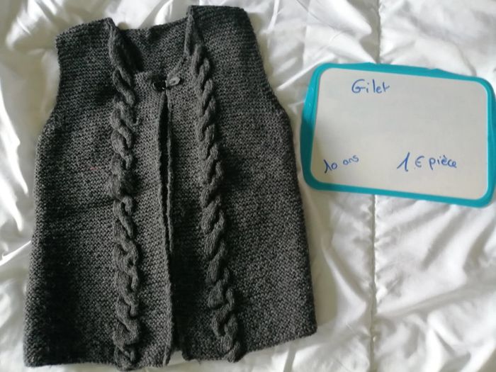 A vendre gilet sans manche gris avec juste une boutonnière en haut, torsadé sur le devant, taille 10 ans