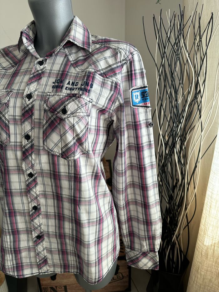 🌺🌺 Chemise blanche avec carreaux violet , manches longues , patchwork cousu aux manches , broderie sur le devant , boutonnière sur le devant Taille S Jack & Jones. Seconde main en très bon état 🌺🌺