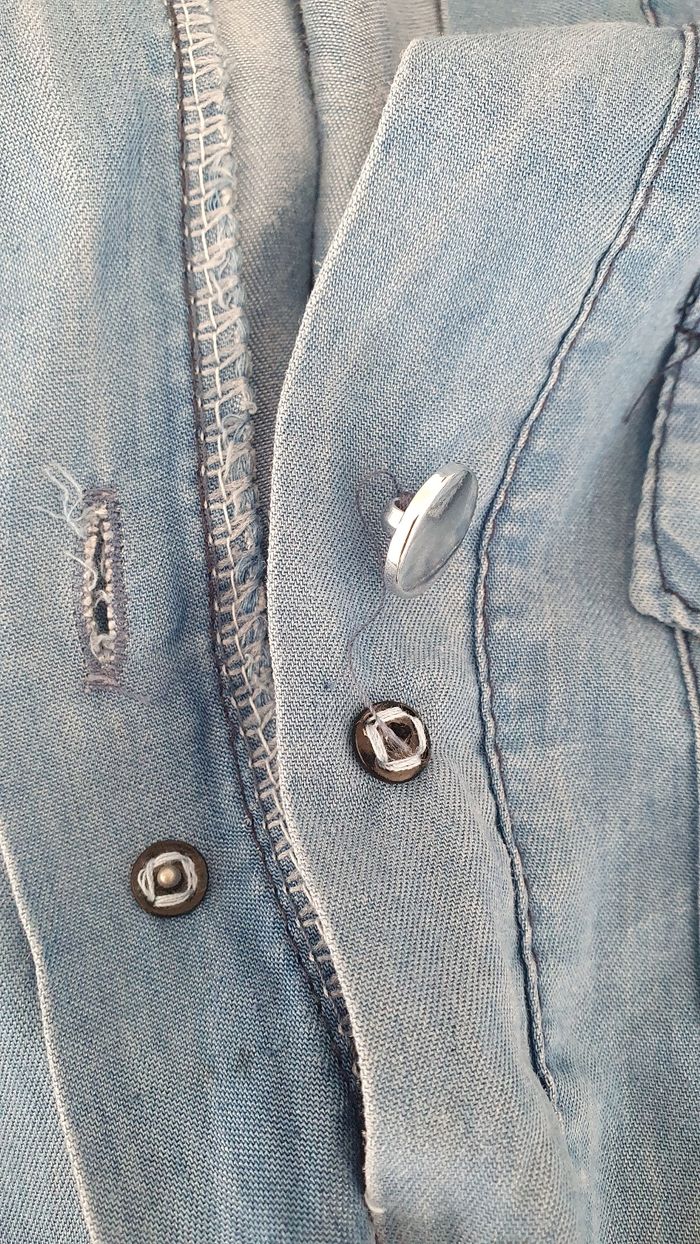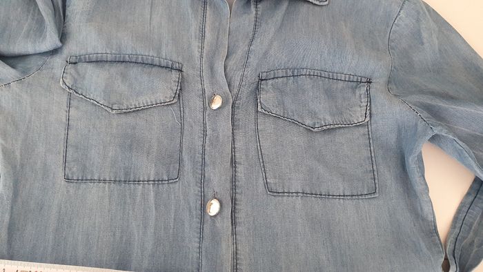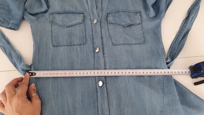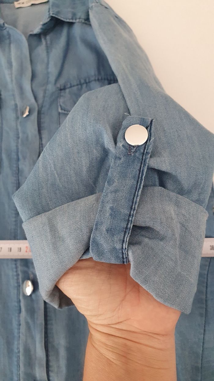 Robe courte légère en jean très agréable à porter J'ai ajouté une pression entre 2 boutons Possibilité de remonter les manches et de les attacher par un bouton Avec une ceinture