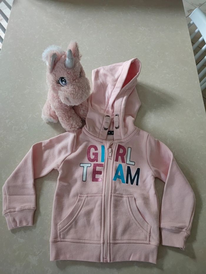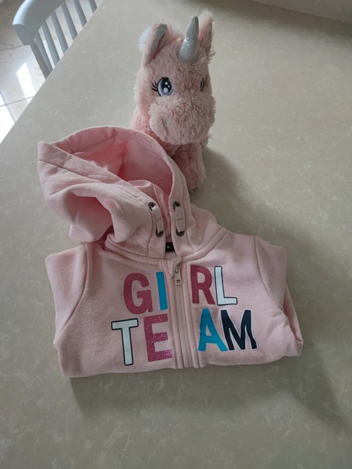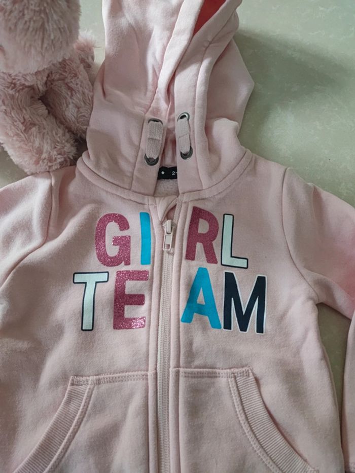 Gilet rose pâle avec fermeture éclair et capuche écrit girl team dessus avec paillette. #pepettechoupette_3ans #giletcapuchefille #gilet3ansneuf