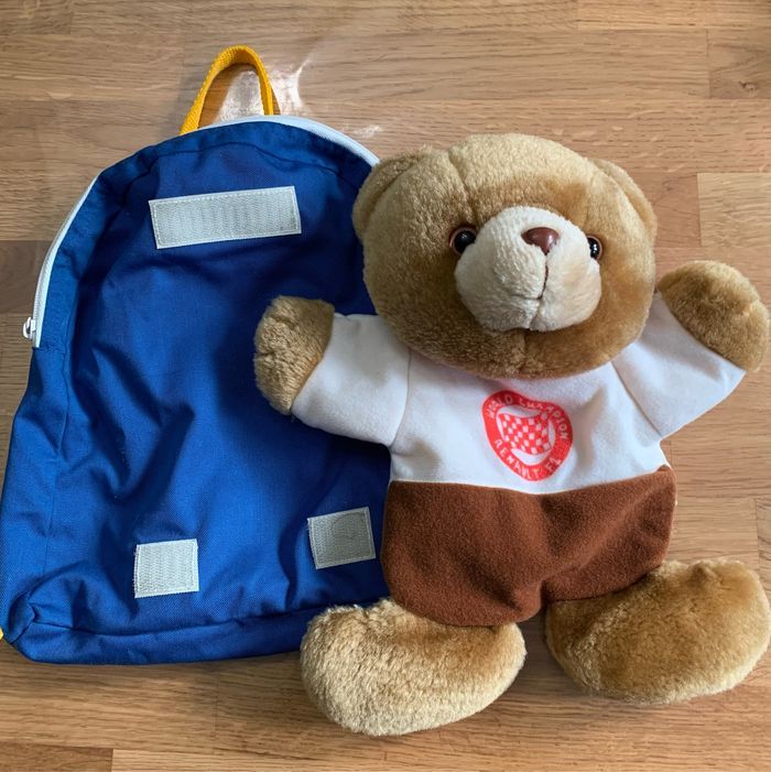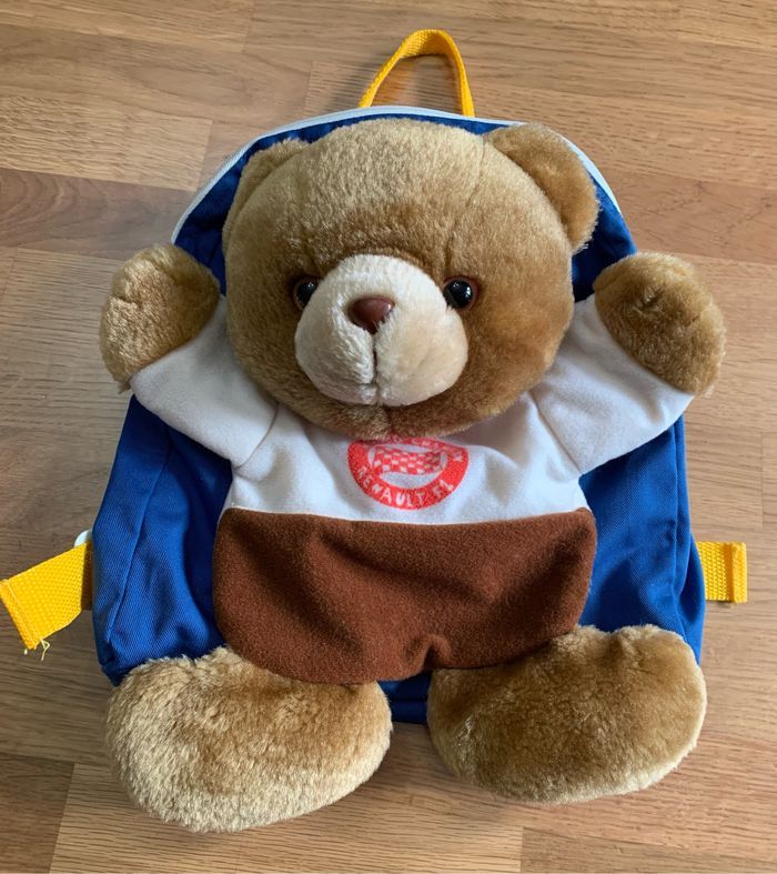 Vends petit sac à dos pour enfant avec ourson en peluche détachable par velcro. Marque Renault F1. Environ 28 cm de haut.
