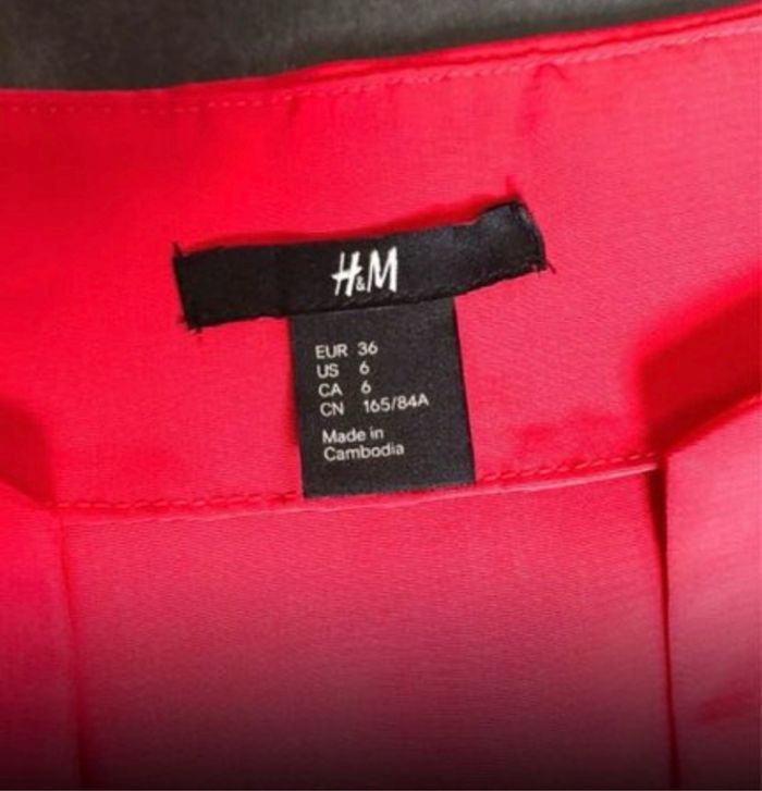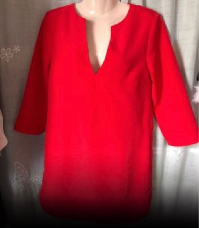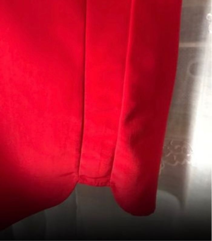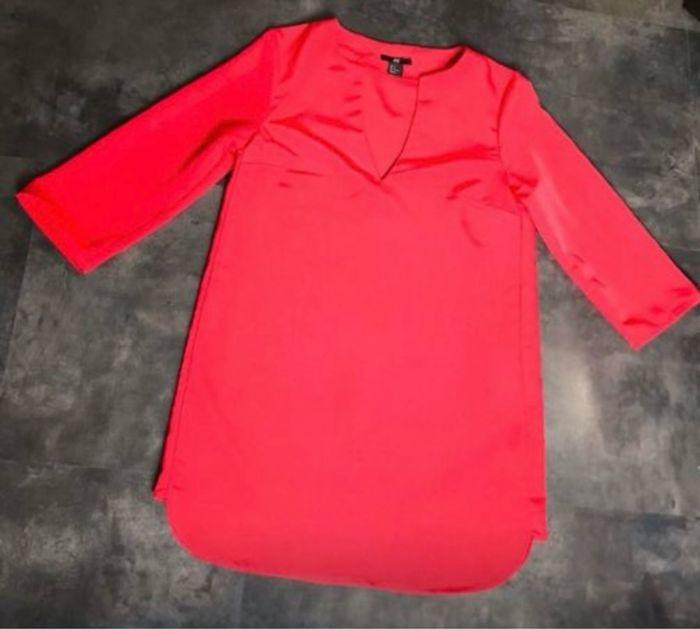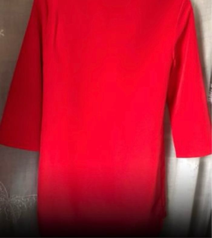 Jolie petite robe rouge très agréable et légère à porter manches 3/4 arrondie dans le bas de la robe 100% polyester la ceinture est pour donner une idée comment la porter mais n’est pas vendue avec la robe taille 36 H&M