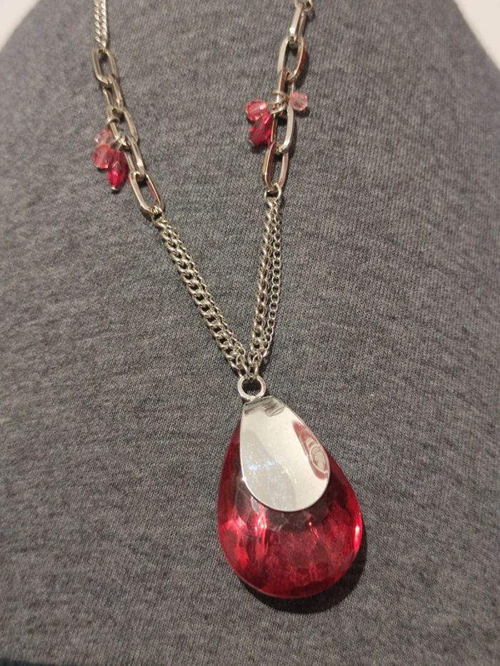 Collier fantaisie métal argenté et pierre rouge imitation saphir - photo numéro 2