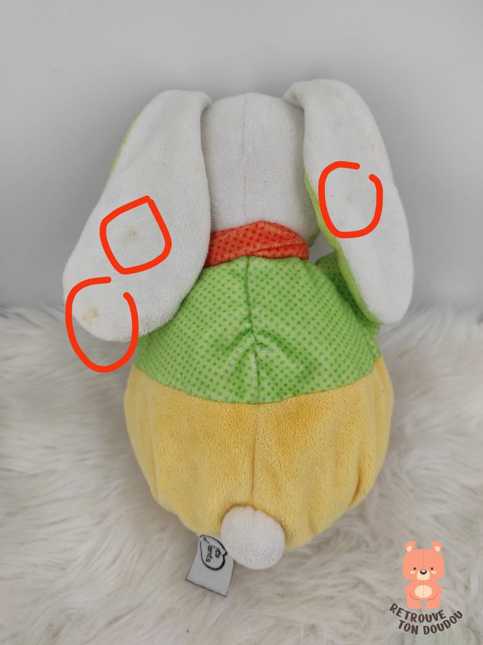 🐇 Doudou Lapin Blanc vert et jaune, mots d'enfants, leclerc 📏 Dimension : 23 cm environ ✨ Occasion, très bon état mais tâché 🧼 Lessivé avec lessive hypoallergénique 👀 Vous achetez le doudou que vous voyez sur les photos.