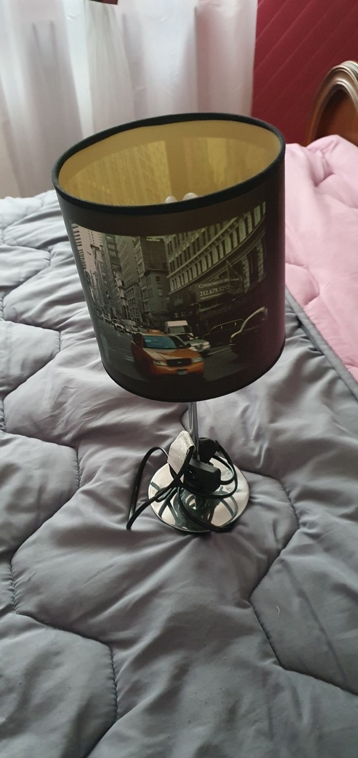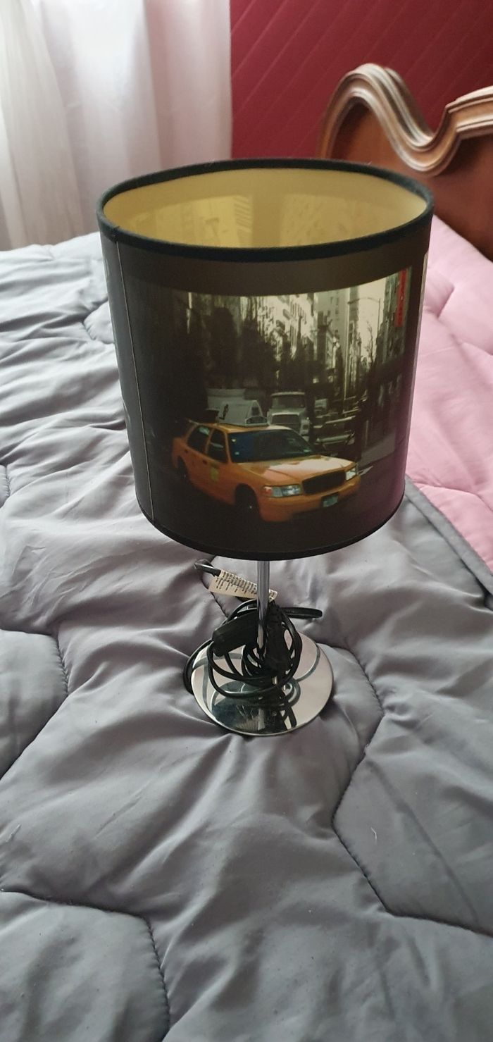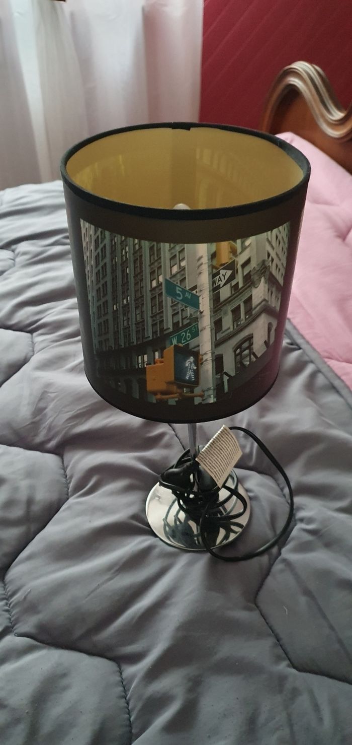Rideaux doublés, coussins New York, petits cadre et lampe de chevet