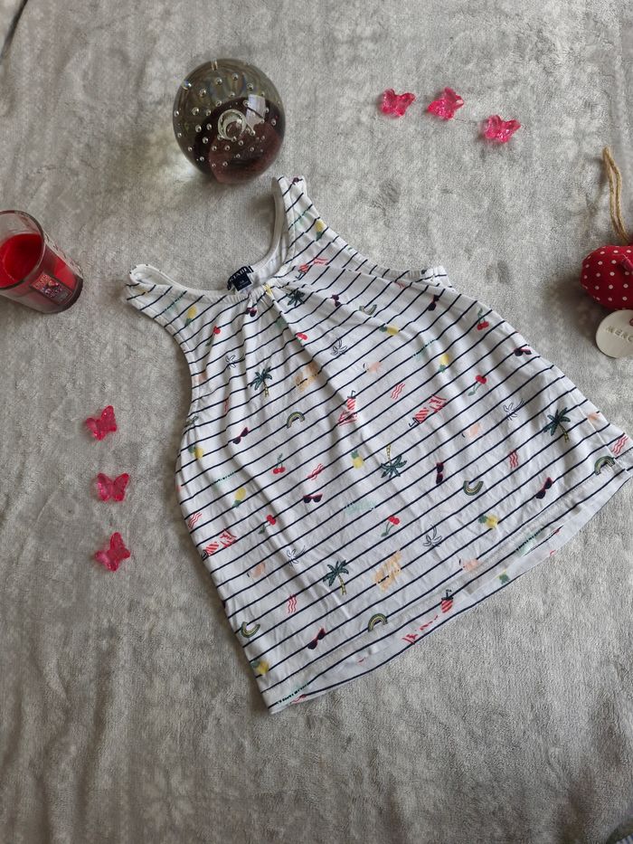 Debardeur blanc rayée bleu marine avec des motif "plage" Kiabi 5ans