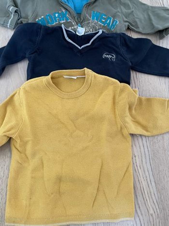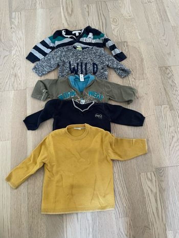 Lot de 5 pulls taille 12 mois : 1 jaune 1 bleu marine 1 kaki avec col à fermeture éclair 1 bleu et blanc avec inscription « wild » 1 à rayure Lulu Castagnettes