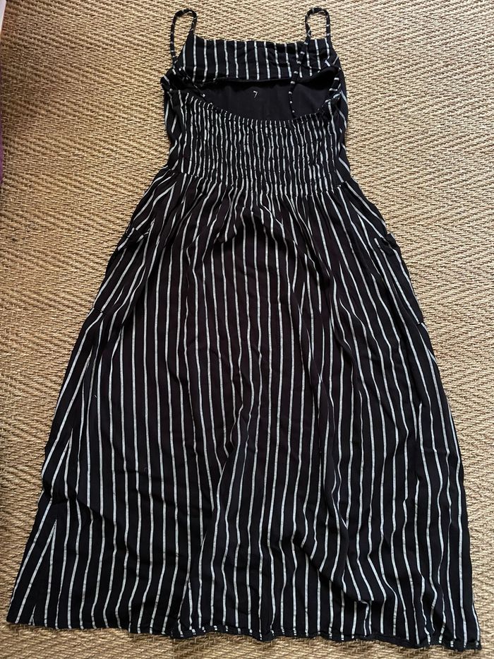Fines bretelles Faux boutons Élastique fronçante au dos Très jolie coupe Mi-longue (sous le genou) Neuve Aucun défaut 👍 Pas d’étiquette de taille mais c’est une 38 Pas d’étiquette de composition 2 poches plaquées devant (pratique)