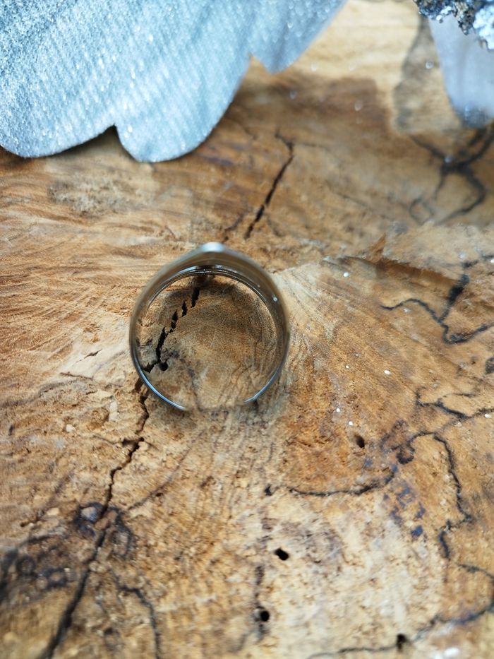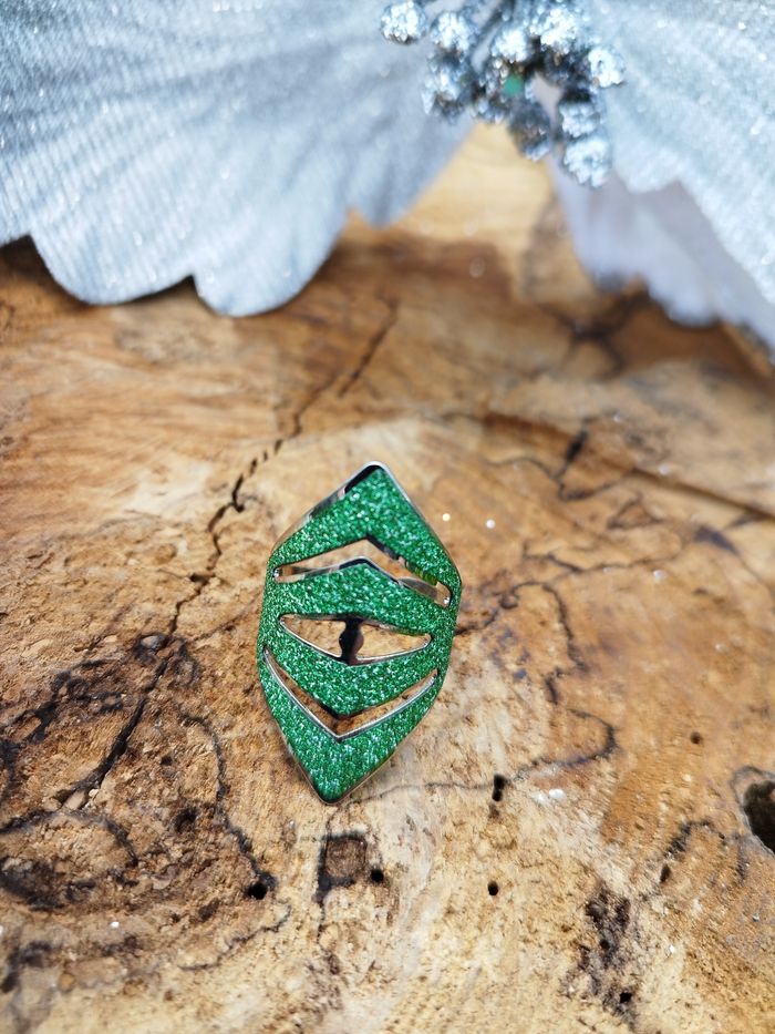 Bague réglable (voir la partie arrière) verte avec une base argentée. Neuve