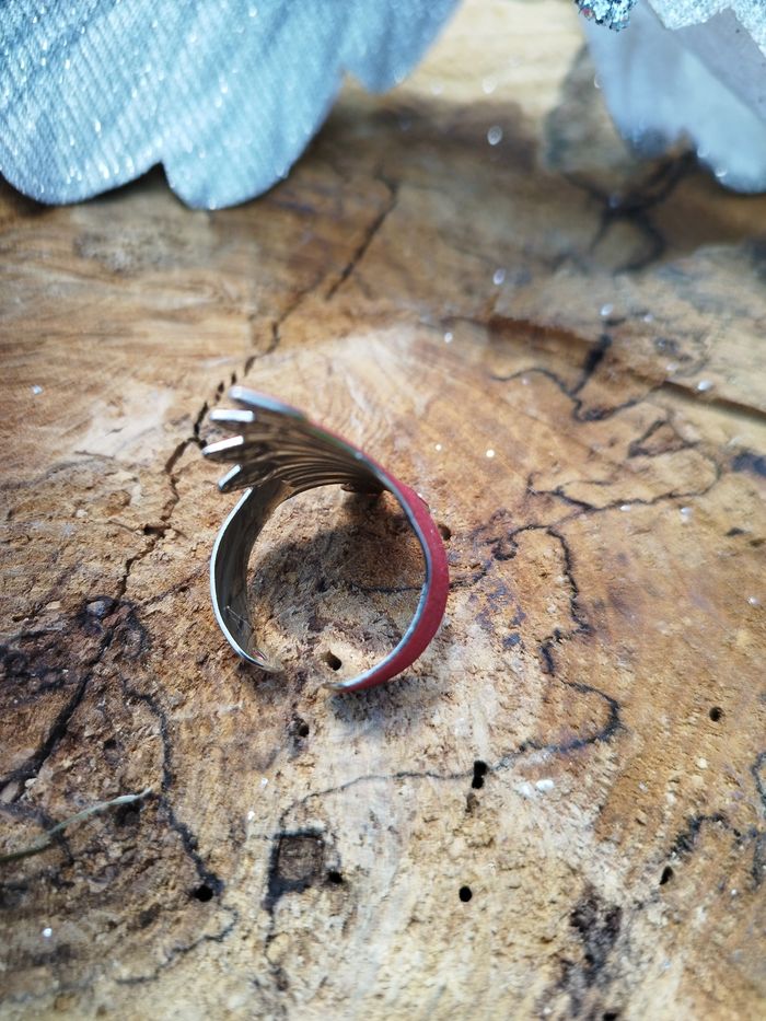 Bague réglable (voir la partie arrière) rouge avec une base argentée. Neuve