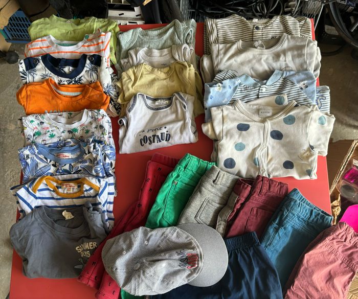 Lot 6 mois été T-shirt manche courte X8 Bodies manche courte x3 Bodies manche longue x1 Pantalon x6 Short x1 Pyjama léger x4 Casquette TRÈS BON ÉTAT Plusieurs marques