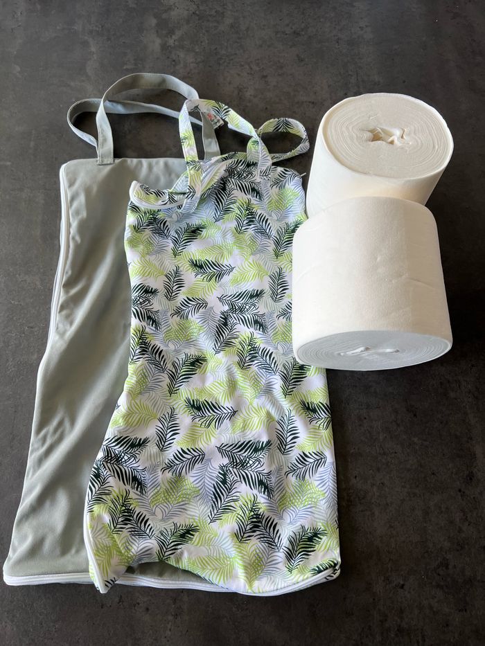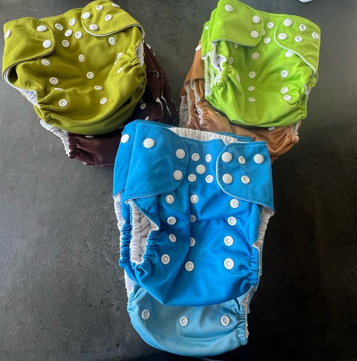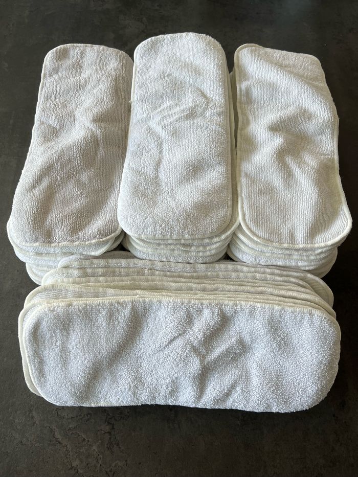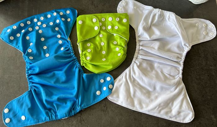 25 couches lavables réglables de la naissance à l’acquisition de la propreté grâce aux pressions. 60 inserts micro fibres 2 rouleaux de feuilles à glisser à l’intérieur 2 sacs imperméables La plupart n’a pas été utilisé, le reste a servi seulement 1 mois . Tout est en excellent état.