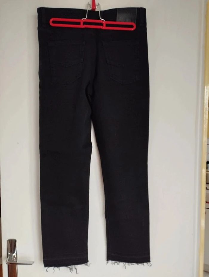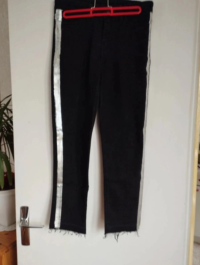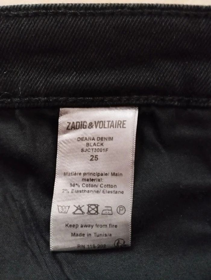 Jean noir Zadig&Voltaire, coupe boyfriend avec bandes latérales argentées effet peinture irreguliére (voir photo ) Bas effiloché 98 % coton 2 % élasthanne Modèle : Deana trés peu porté Taille 25 US.