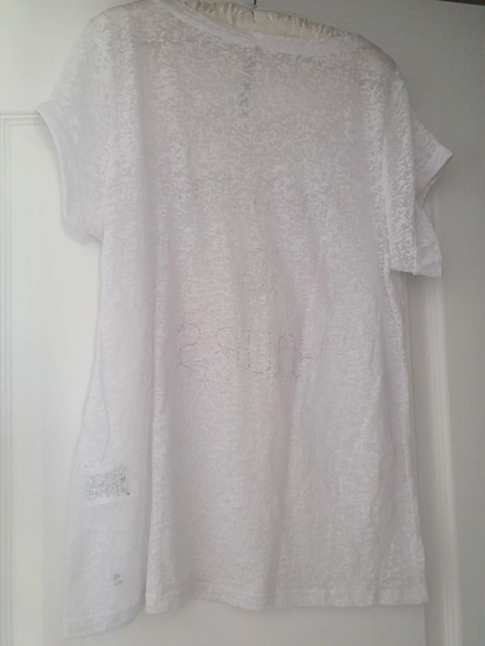 Très bon état très peu porté Matière fluide manches courtes à revers Legerement transparent Inscription blanche sur la poitrine #laetihingantfemme40