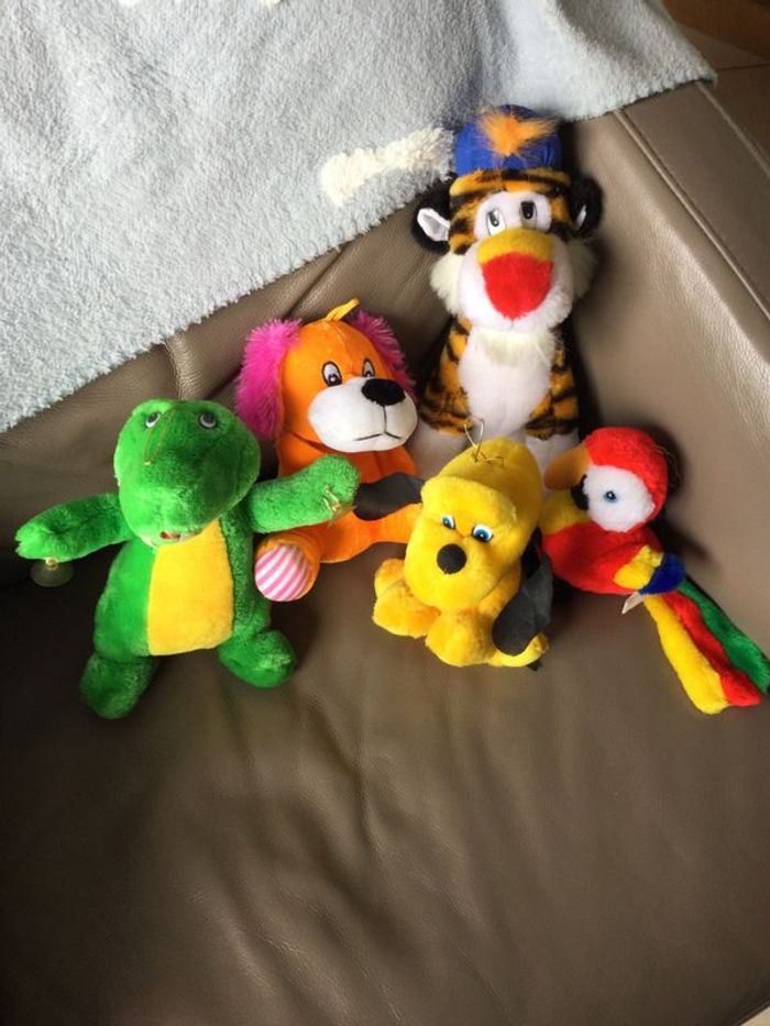 Lot de 5 peluches : chien orange fluo, tigre, perroquet, chien, dinosaure. Possibilité de séparer le lot me contacter