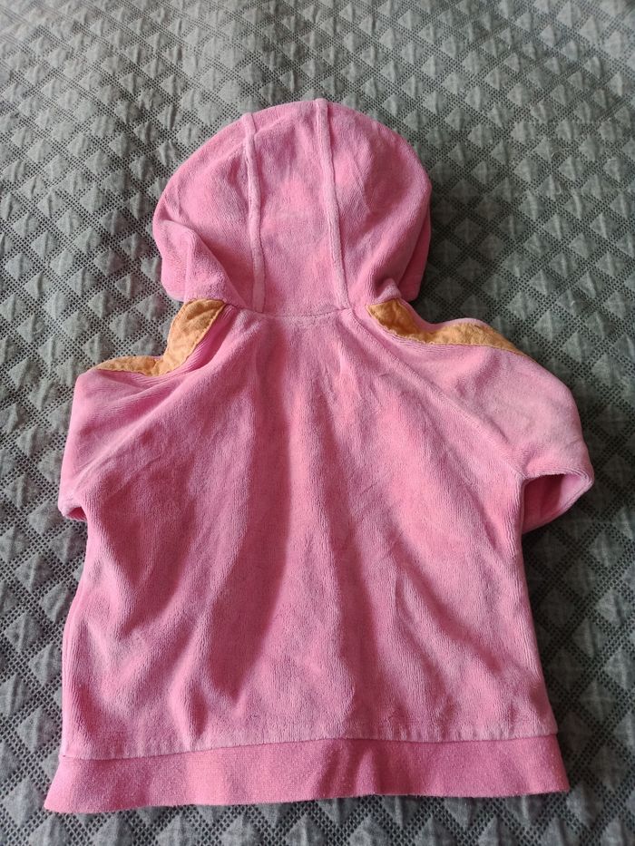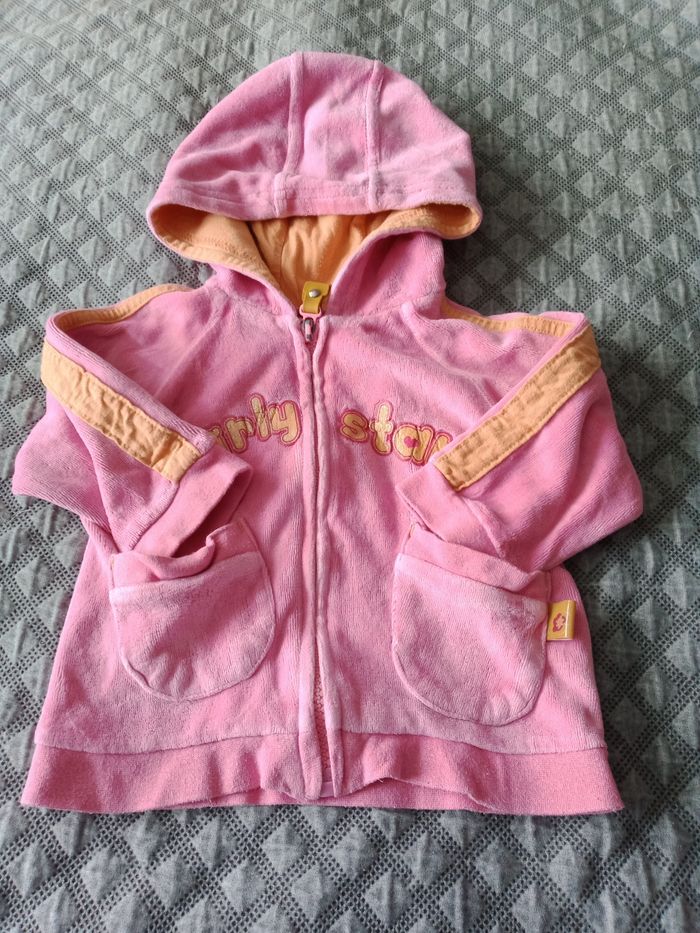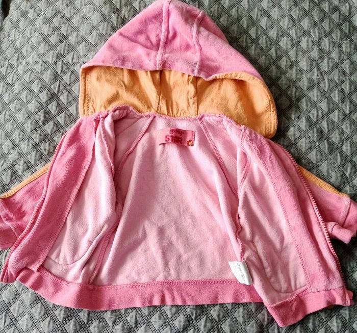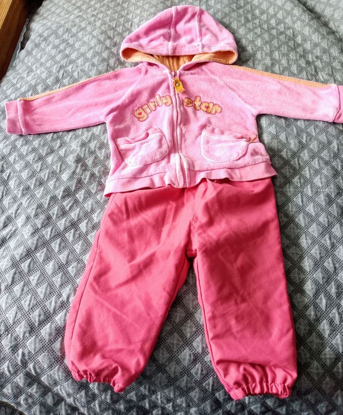 Ensemble sweat à capuche et pantalon Pantalon 100% polyester avec une doublure 100% coton Taille élastique ainsi que le bas du pantalon Le haut à capuche doublée se ferme par une fermeture éclair Sur le devant deux petites poches Inscription girly star en relief et pailleté sur les manches une bande rappelant l'intérieur de la capuche et de l'impression Manque un peu de couleur sur la fermeture Marque Girly Star 6 mois 80% coton - 20% polyester