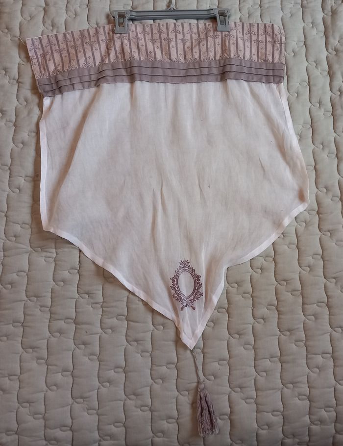 Brise-Bise gansé de tissu romantique fleur avec broderie et pompon, Passage barre de fixation, Lavable 40° Décoration Ambiance Shabby Composition 100% coton Dimensions Disponibles : 54(large) x 68 cm (long) envoi rapide et protégé possibilité de faire une offre en lots