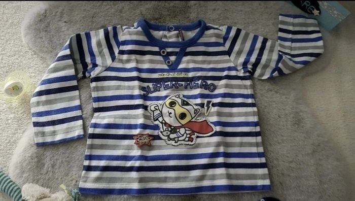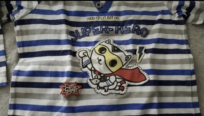 T.shirt manches longues Sergent Major rayé bleu et blanc. Dessin chat et inscription "Mon chat est un super héros" Ouverture par pressions à l'arrière. Bon état, bien porté