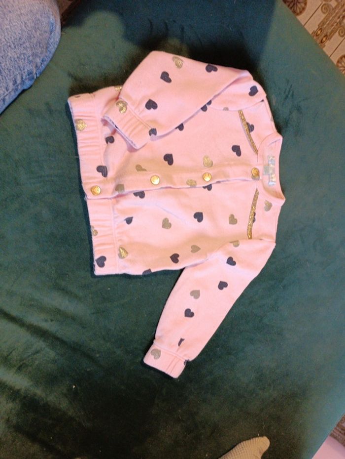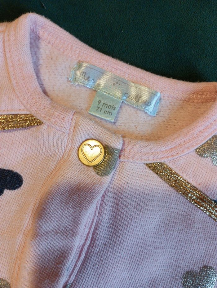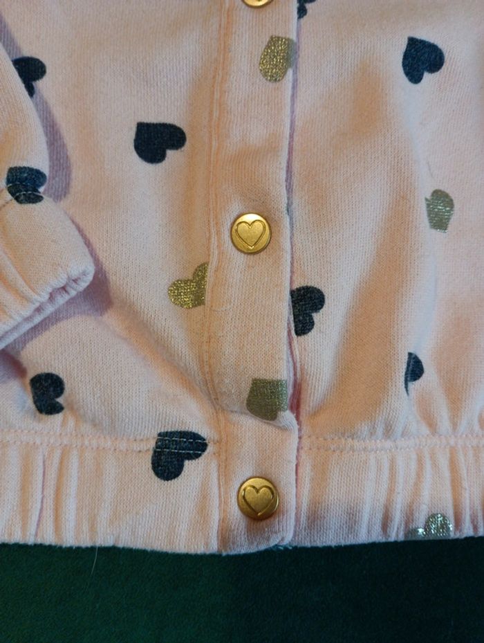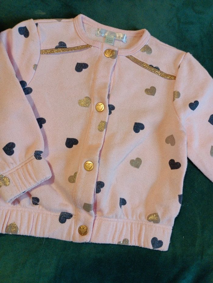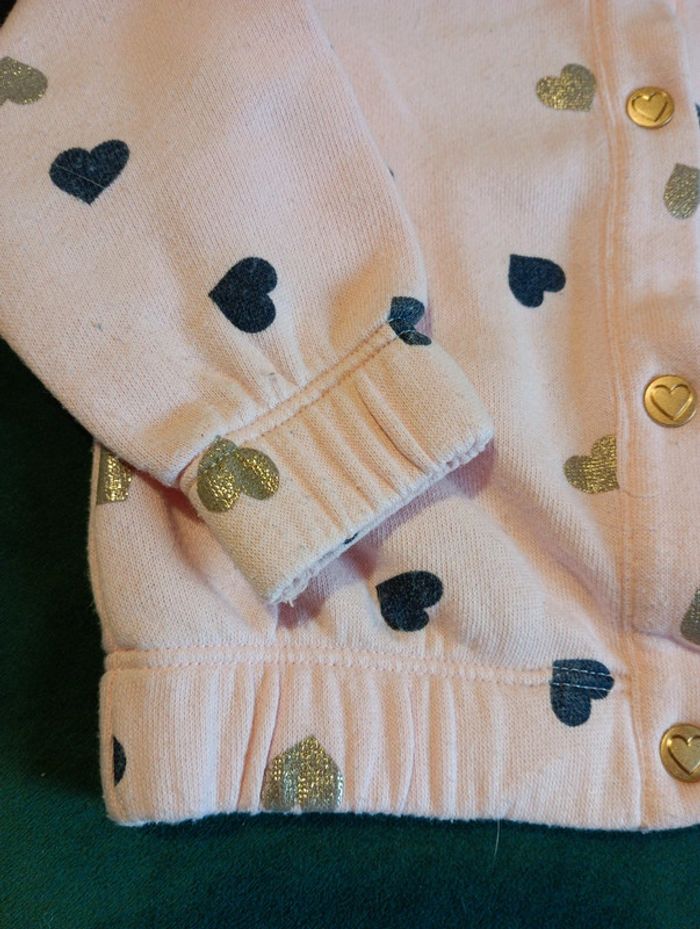 Petit gilet rose poudré, Motifs coeurs noirs et dorés Taille 9 mois, 71 cm, Quelques petites bouloches au niveau des manches et du bas du gilet