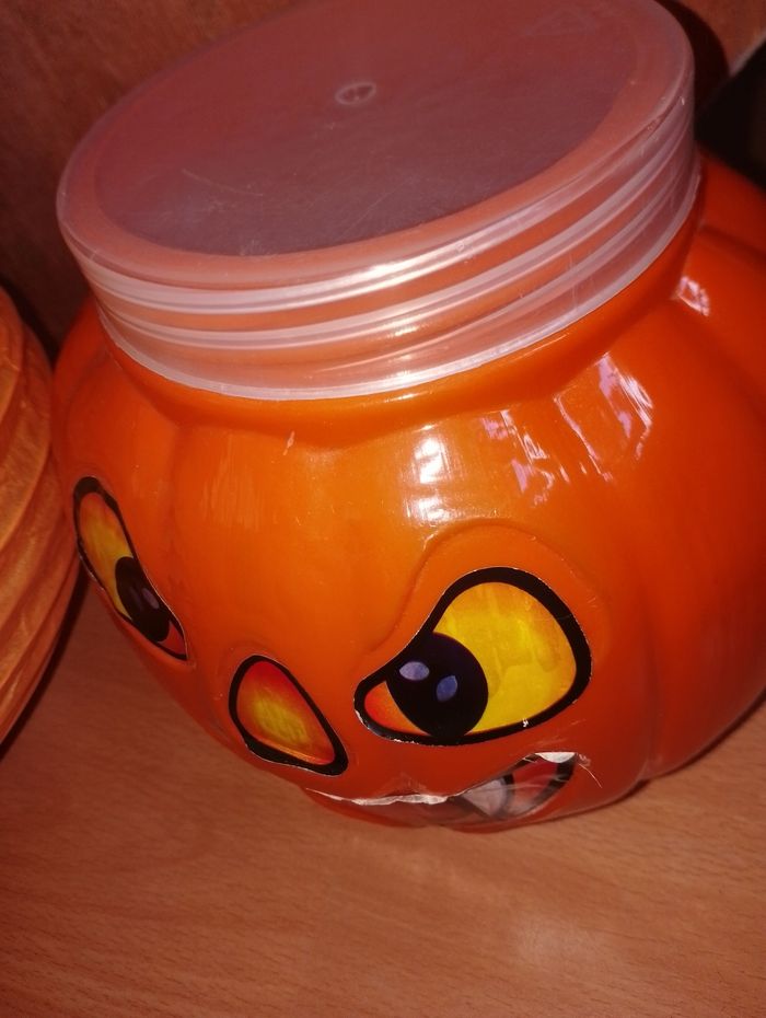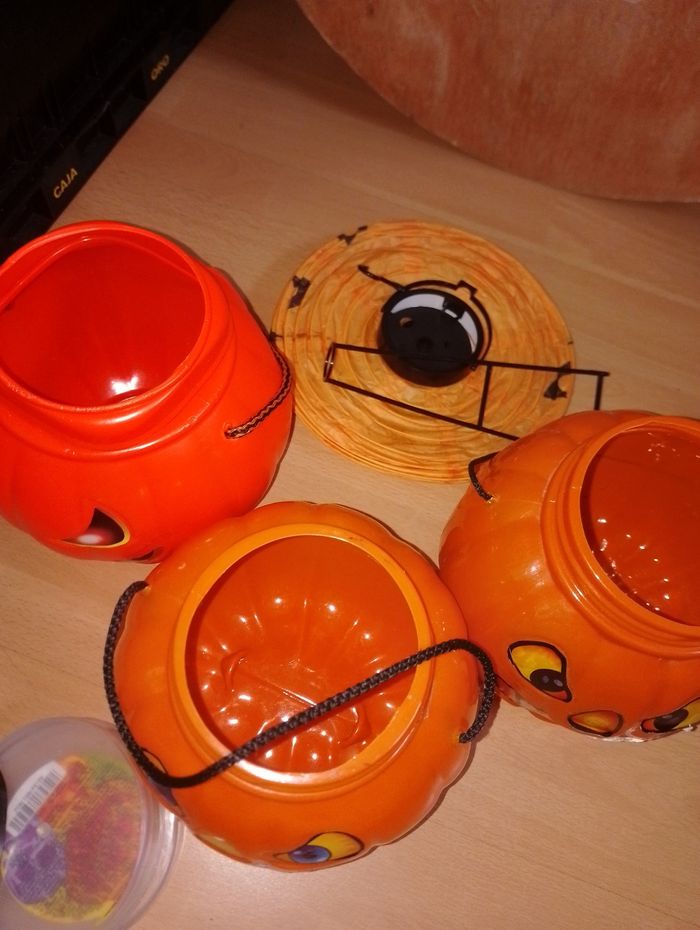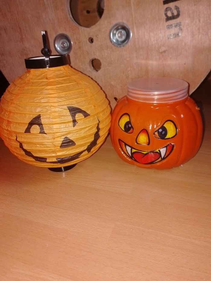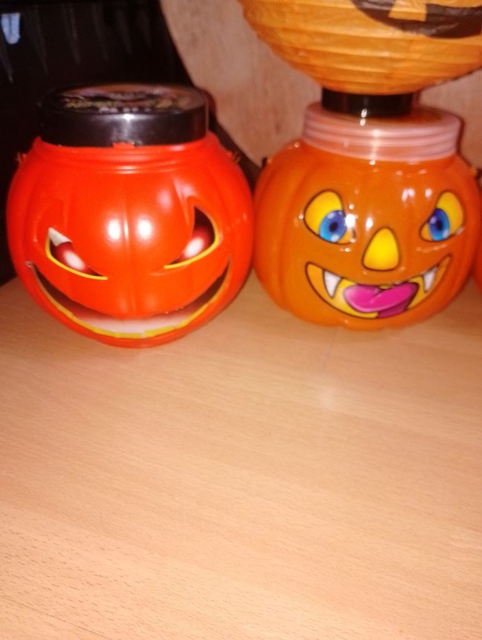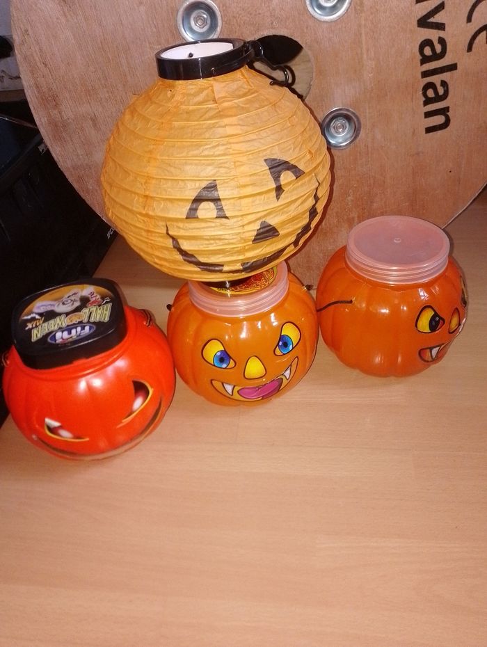 Pot Seau citrouille 5 euro pièce Idéal pour allez récolter des bonbons à Halloween H. 15cm Quelques traces d'usure aux autocollants # Panier sceau pliable à suspendre 2 petits trous ( voir photos) Pas de système pour fonctionner à piles