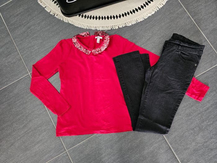 Bonjour 👋 Je vend cette: 👉 t-shirt " okaidi" 12 ans Rouge avec sequin au col 👉 jean 12 ans Noir Maison non fumeur et sans animaux