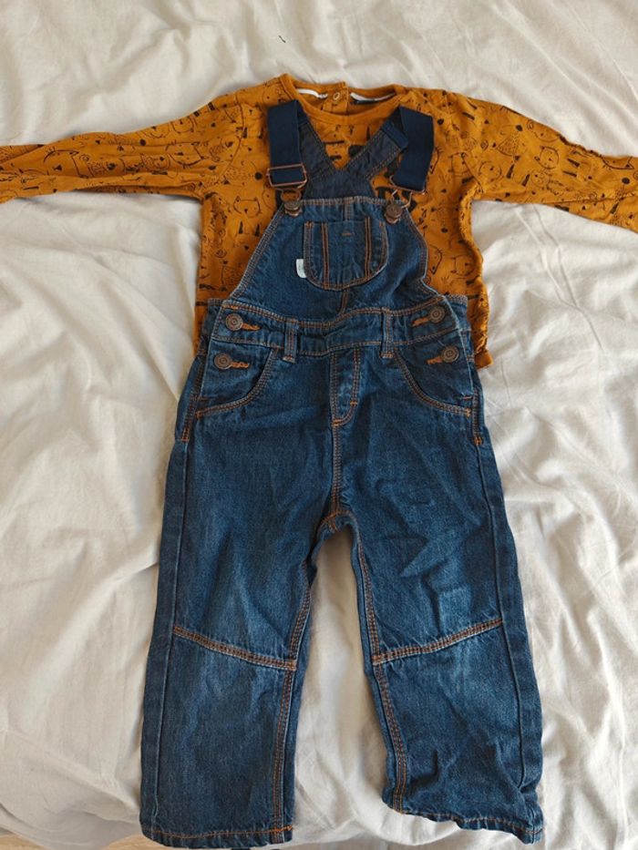 Ensemble composé d'une salopette en jean et d'un tee shirt manches longues. Sans trou ni tâche et les pressions sont ok. Le tee shirt a des pressions à l'arrière en haut pour faciliter l'habillage/déshabillage. N'hésitez pas à me demander plus de photos infos #or_et_litgarçon18mois
