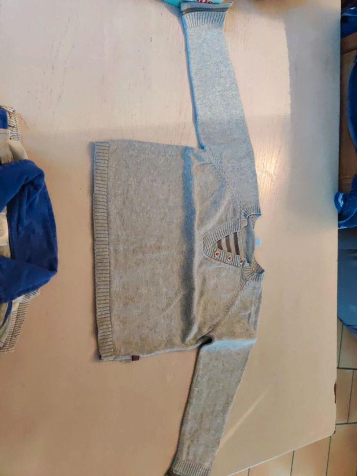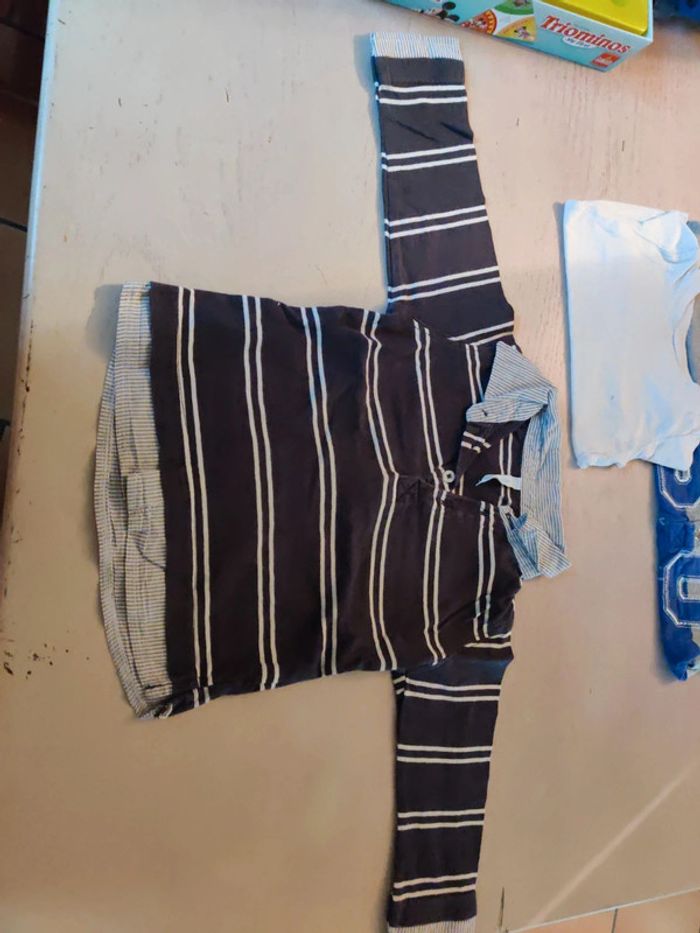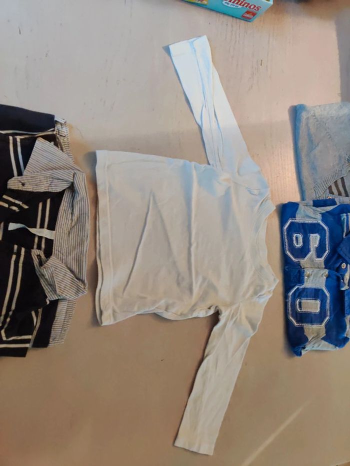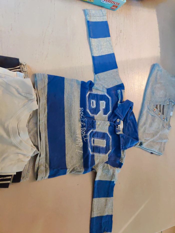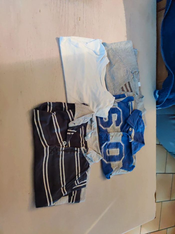 Lot en bon état la première photo est un polo manches longues Gémo baby la deuxième photo le haut blanc est un haut in extenso le troisième un polo manches longues kimado et le dernier un pull de la marque obaibi