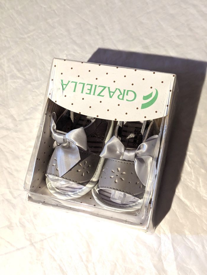 Petites Sandalettes Blanches et Grises avec un Flot Ruban Gris Clair et une Fermeture à Scratch. Accessoire pour les Petits Enfants et les Bébés. ☑ "Petites" Sandalettes. ☑ Flot - Ruban "Gris". ☑ Fermeture "Scratch". Spécifications: Dimensions d'une Sandalette: Env. 12,5 x 7 x 6 cm Longueur d'une Sandalette (Pied): Env. 11 cm Taille (Pointure): 18 Pour: 6 - 9 Mois Couleurs Dominantes: Gris - Blanc Couleur du Flot - Ruban: Gris Clair Réf: ch6
