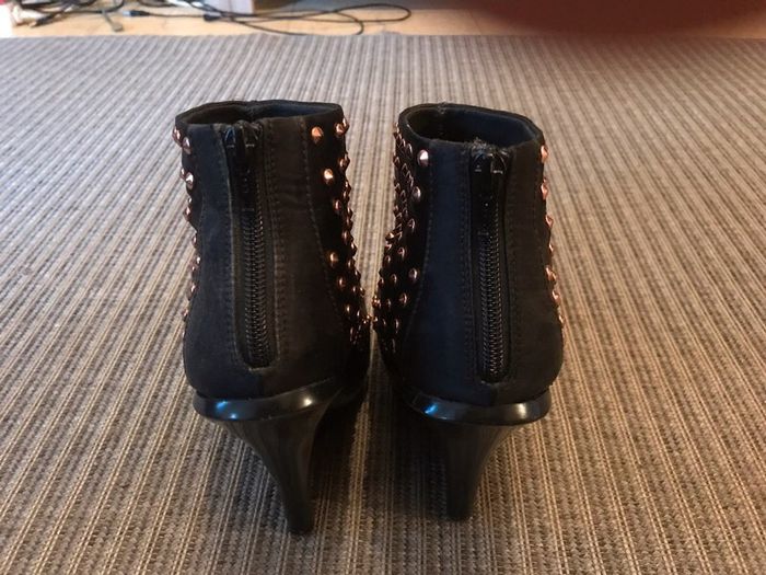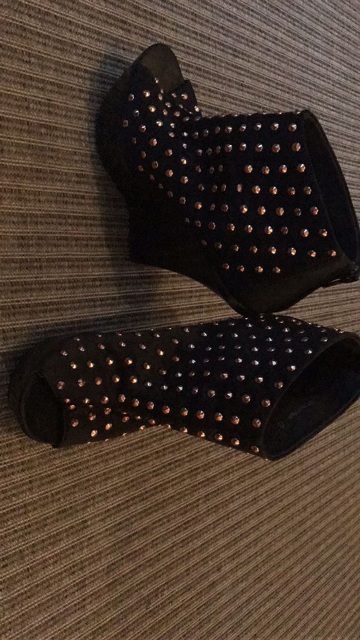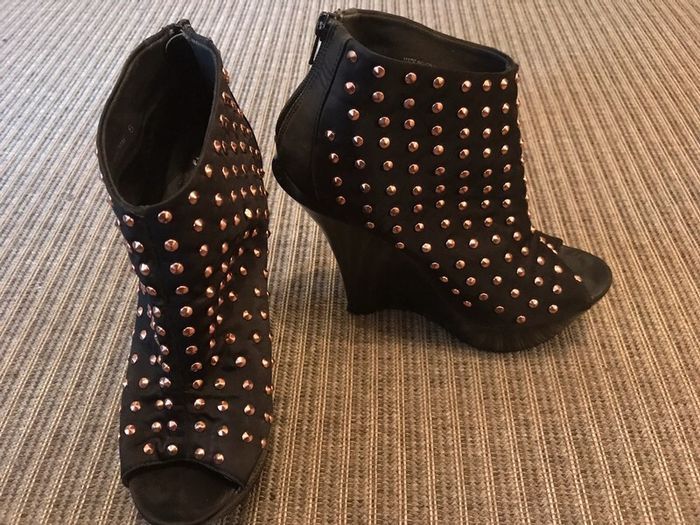 Jolies bottines compensées Asos, taille UK8 très confortables! Manque un petit "picot" doré sur le pied droit, à peine remarquable. Manque aussi le caoutchouc du talon sur le même pied.