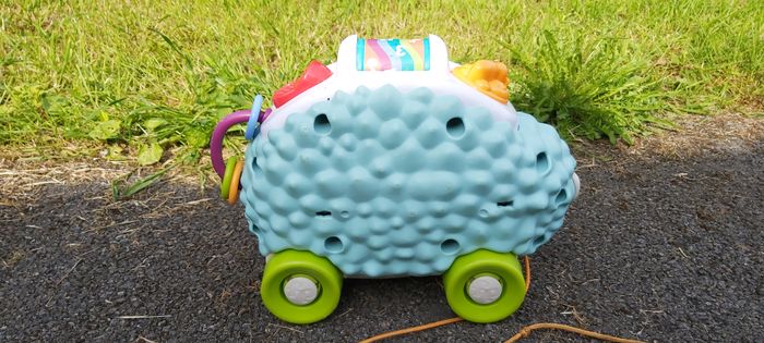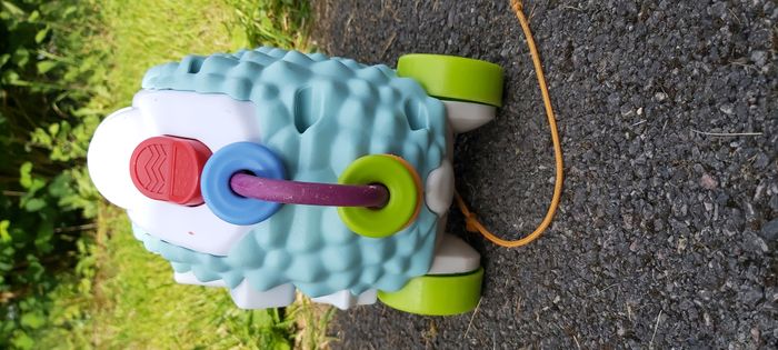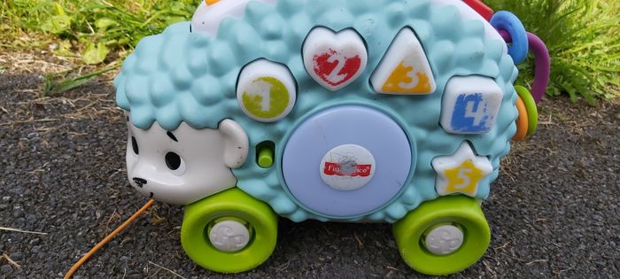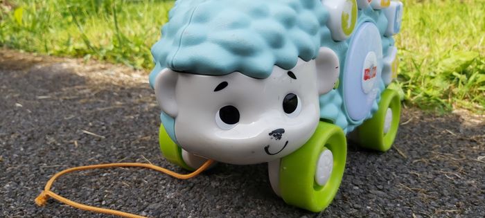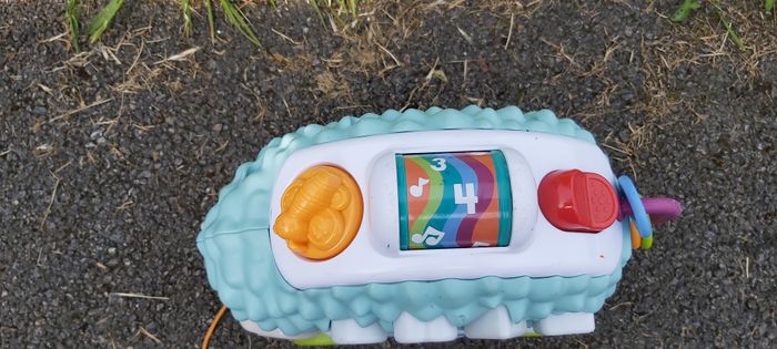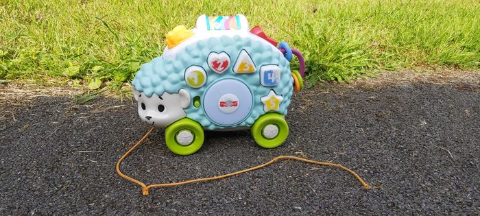 .Louison le Hérisson Son et lumière 5 boutons pour déclencher sons et lumières Sur son dos: un boulier, un interrupteur, un bouton à tourner Permet d'apprendre les couleurs, les formes et les chiffres Ficelle pour le tirer Couleur des boutons un peu effacée Fonctionne avec piles #carineddijeux