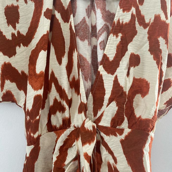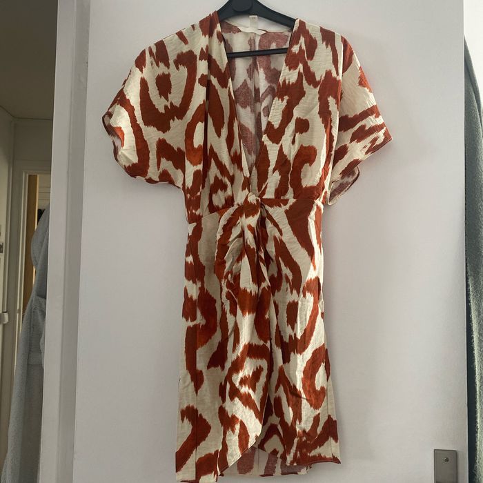 Robe à motif jamais porté, blousant au niveau de la taille plus attache au niveau de la poitrine.