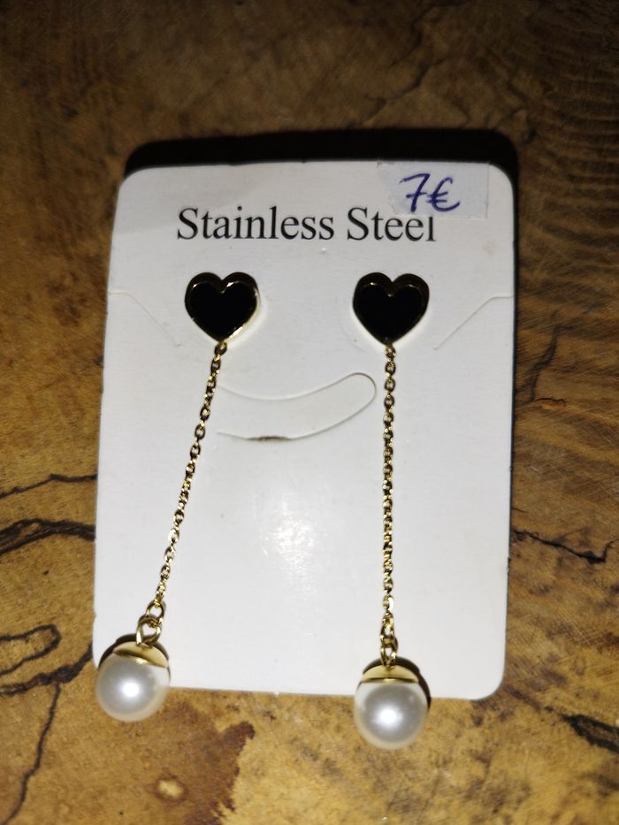 Boucles d'oreilles pendantes en acier inoxydable, coeur noir et sa chaîne dorée avec perle blanche neuves