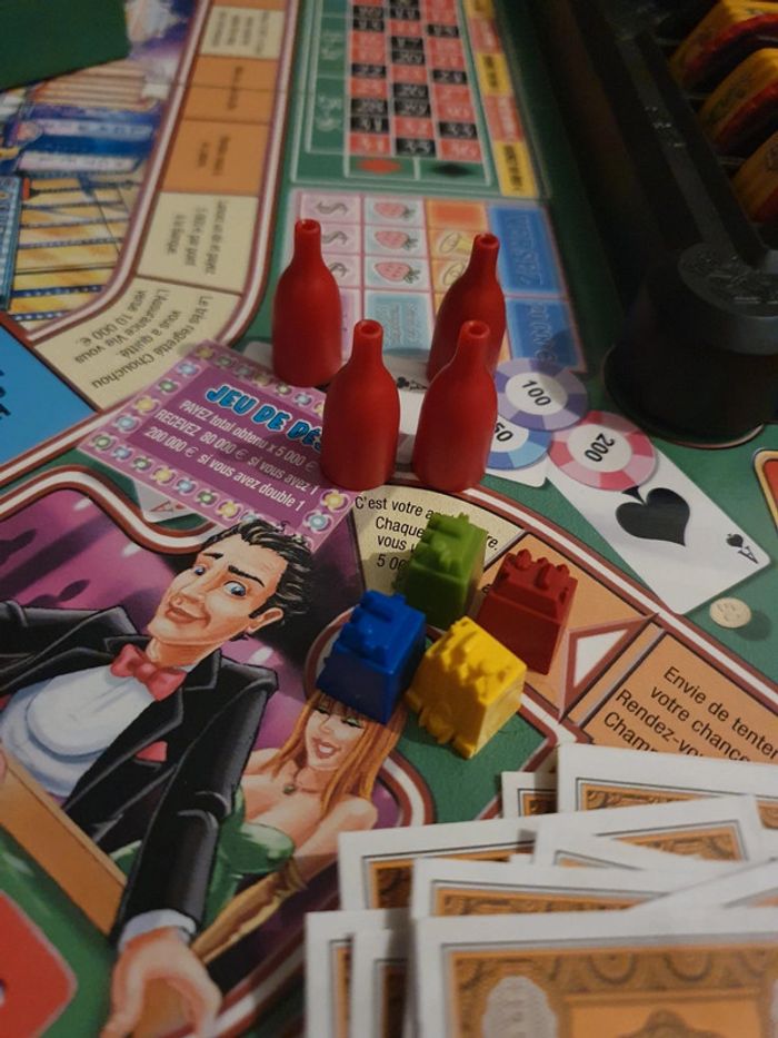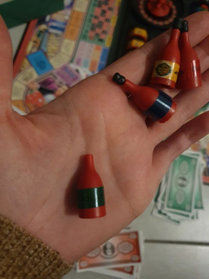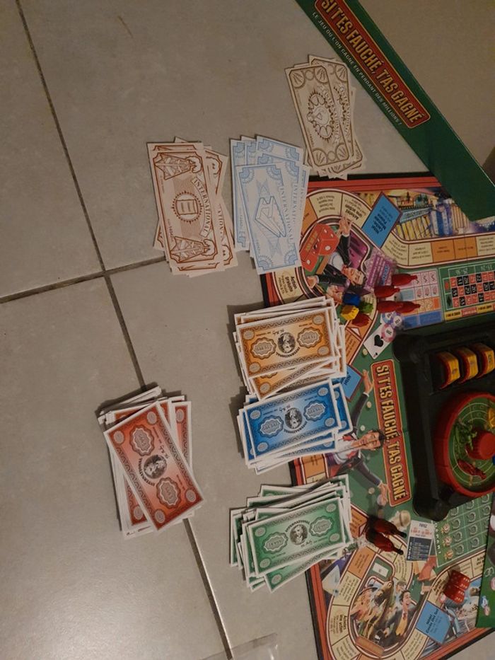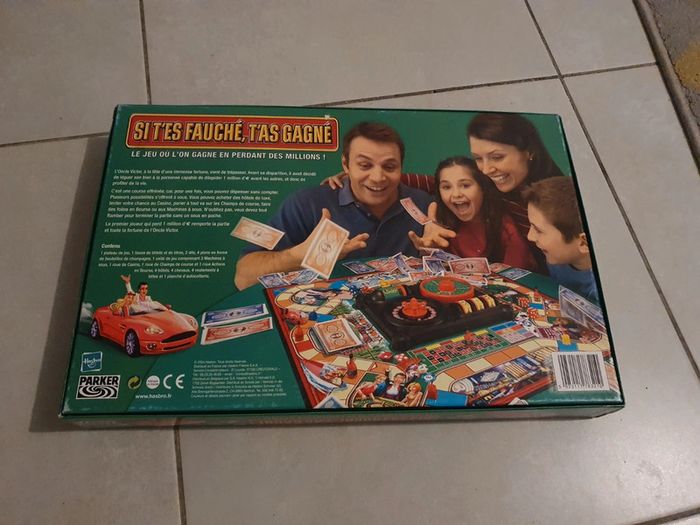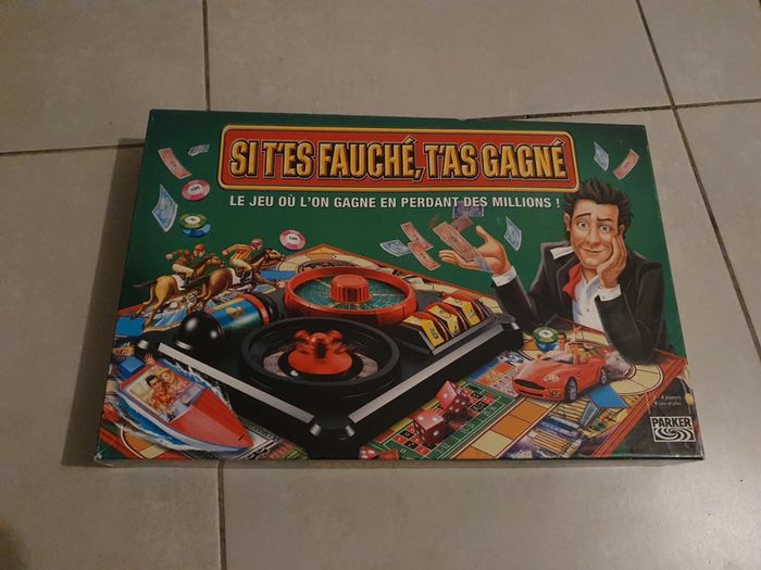 Jeu de société "Si t'es fauché, t'as gagné". Complet et en bon état. Ul petit défaut, un bouchon manquant sur une bouteille et les étiquettes se décollent un peu (voir photo). La boîte est un peu abîmé à certains endroits (voir photo). #jeu #jeux #jeudesociete #sitesfauchétasgagné #parker #plateau