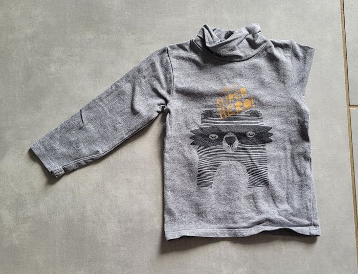 Sous pull, de couleur gris avec motif, de la marque Kiabi, taille 18 mois (77-82 cm), en très bon état. Article lavé pour la vente.
