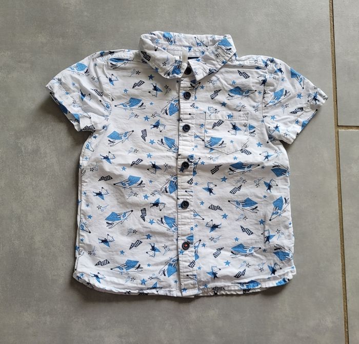 Chemise manches courtes, de couleur blanc avec motifs dans les tons bleus, de la marque Orchestra, taille 18 mois (81 cm), en très bon état. Article lavé pour la vente.