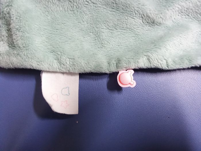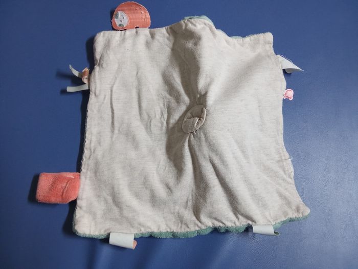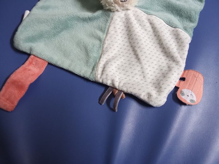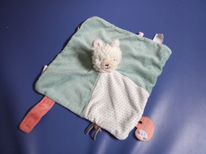 Doudou mouchoir, carré tête chien, ours, blanc, vert eau, attache tétine orange étiquette - photo numéro 6