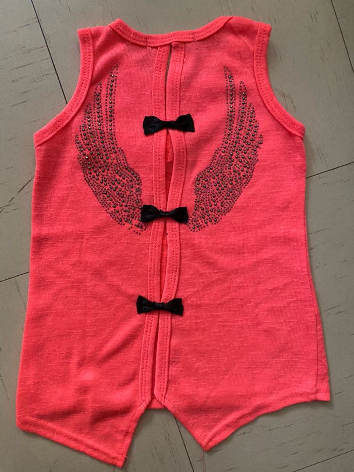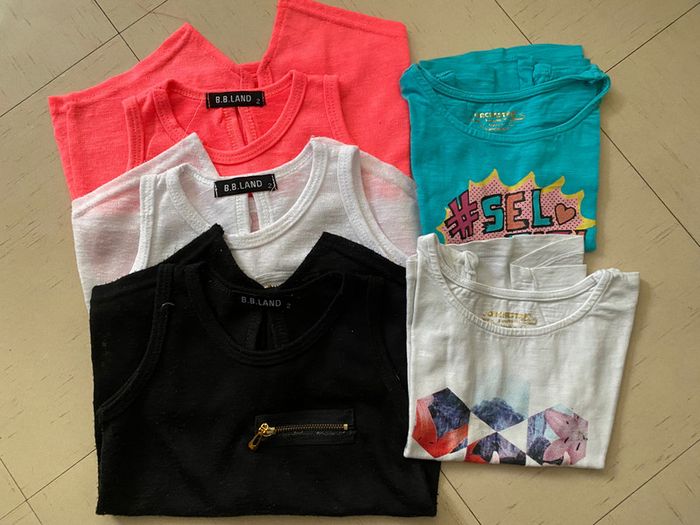 3 débardeurs et 2 tee shirts marque orchestra et boutique indépendante 1 tee shirt blanc et 1 tee shirt turquoise 3 débardeurs noir/ blanc et rose fluo