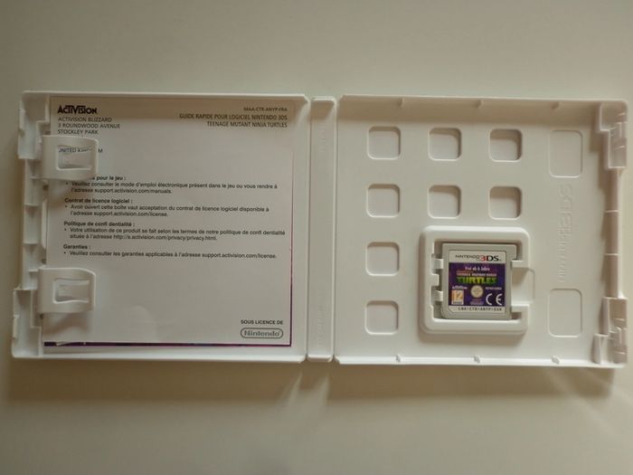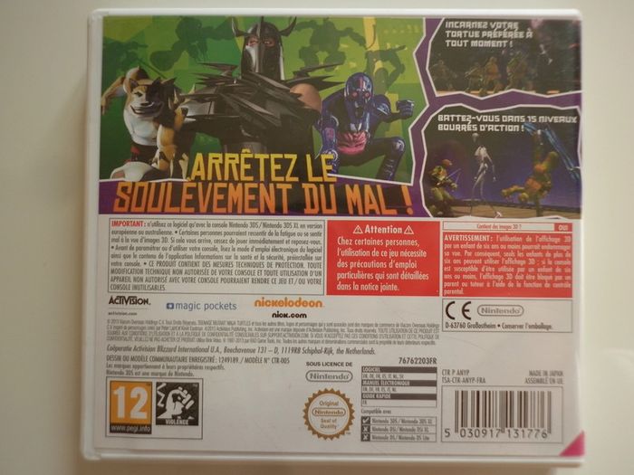 Teenage Mutant Ninja Turtles Jeu Vidéo Nintendo 3DS (en très bon état). Inclus le boitier d'origine et le guide rapide. Le jeu est en Français, Anglais, Italien, Allemand, Espagnol, Néerlandais, Slovaque. Guide rapide en Français. Le boîtier est un peu usé. Allez voir mes autres objets!!