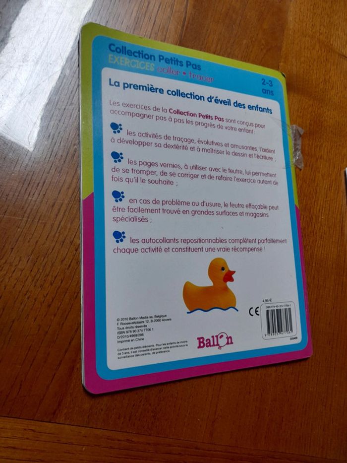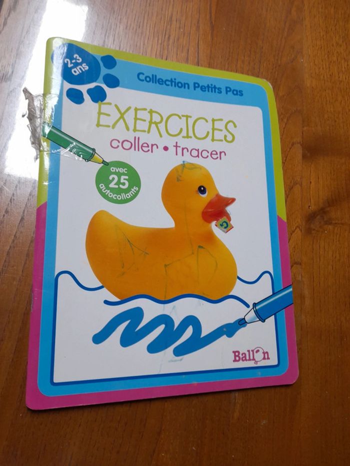 Livre Exercices coller tracer Collection Petits Pas 2/3 ans couverture écrite et un peu abîmée. L'intérieur est en très bon état. Il n'y a pas de feutre.